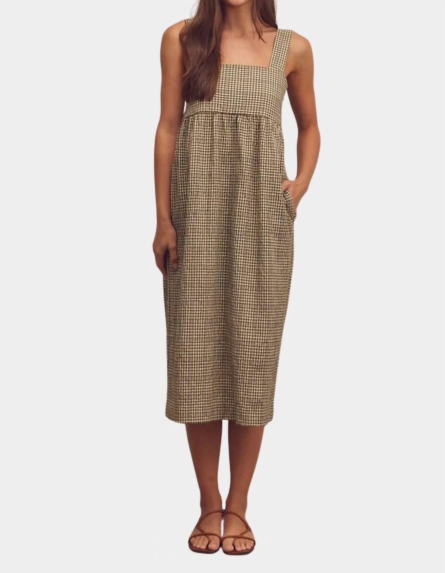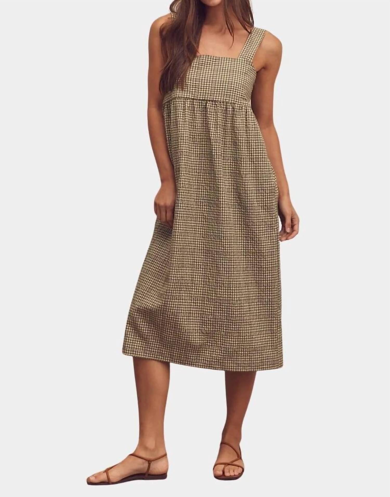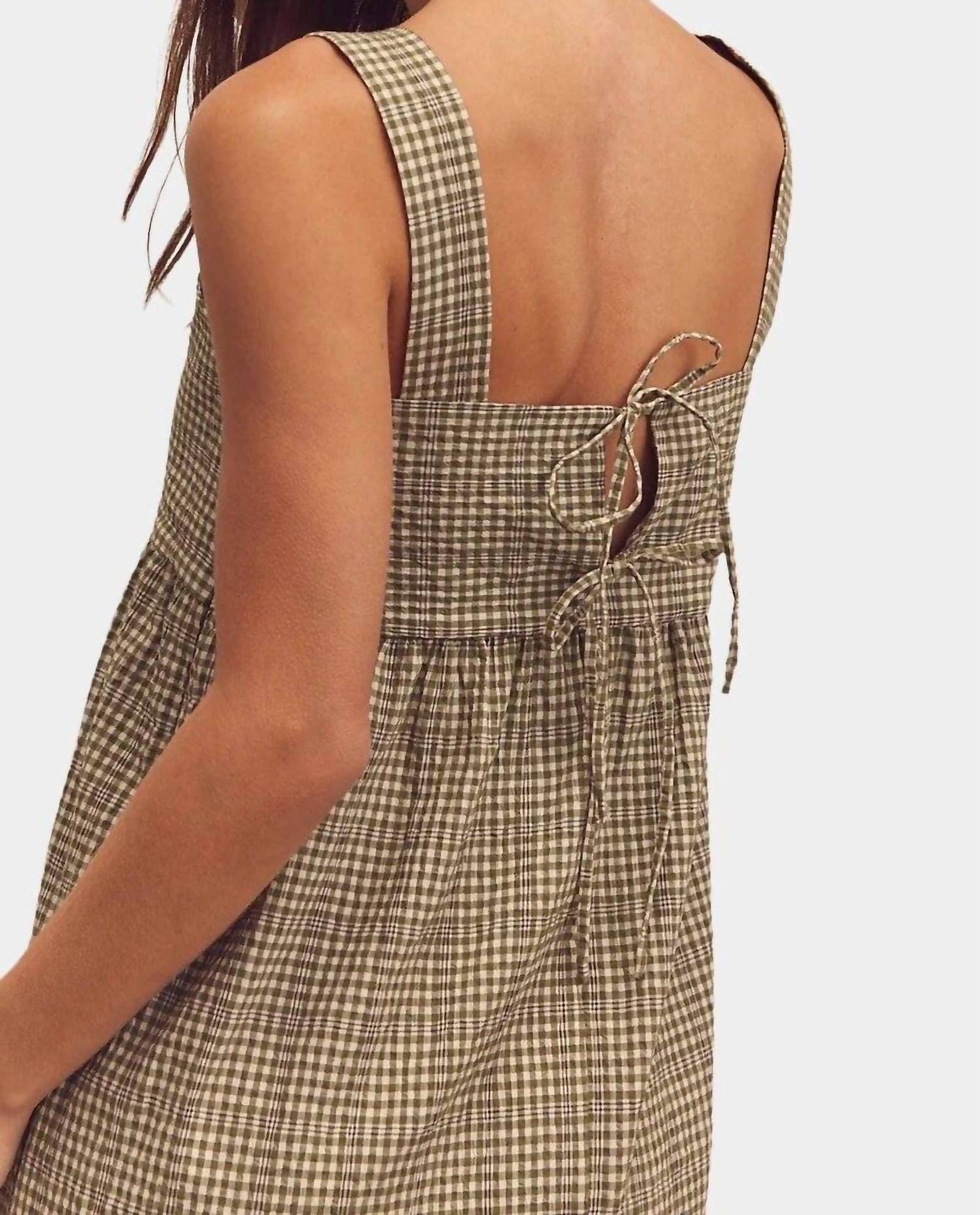 A midi dress so versatile, your options for wearing it are endless. Introducing the Back Tie Midi Dress by Amente, a stylish addition to your wardrobe in a sophisticated olive hue. This sleeveless sheath dress is expertly crafted from a breathable cotton blend (50% Cotton, 48% Viscose, 2% Spandex) and is adorned in a charming gingham pattern. Made in Los Angeles, it features a chic squareneck and a convenient tie closure for a customizable fit. Care: Hand wash and lay flat to dry. Model is 5'9" and wears an XS/S.