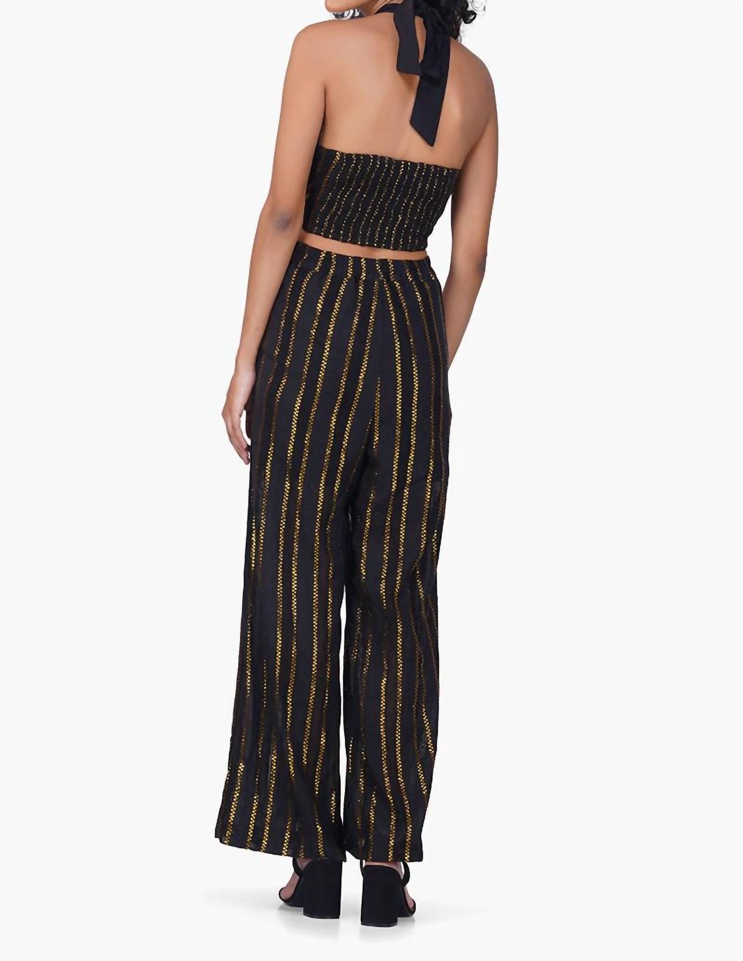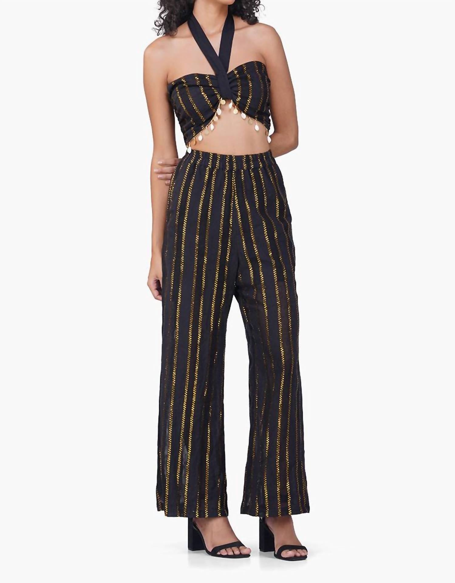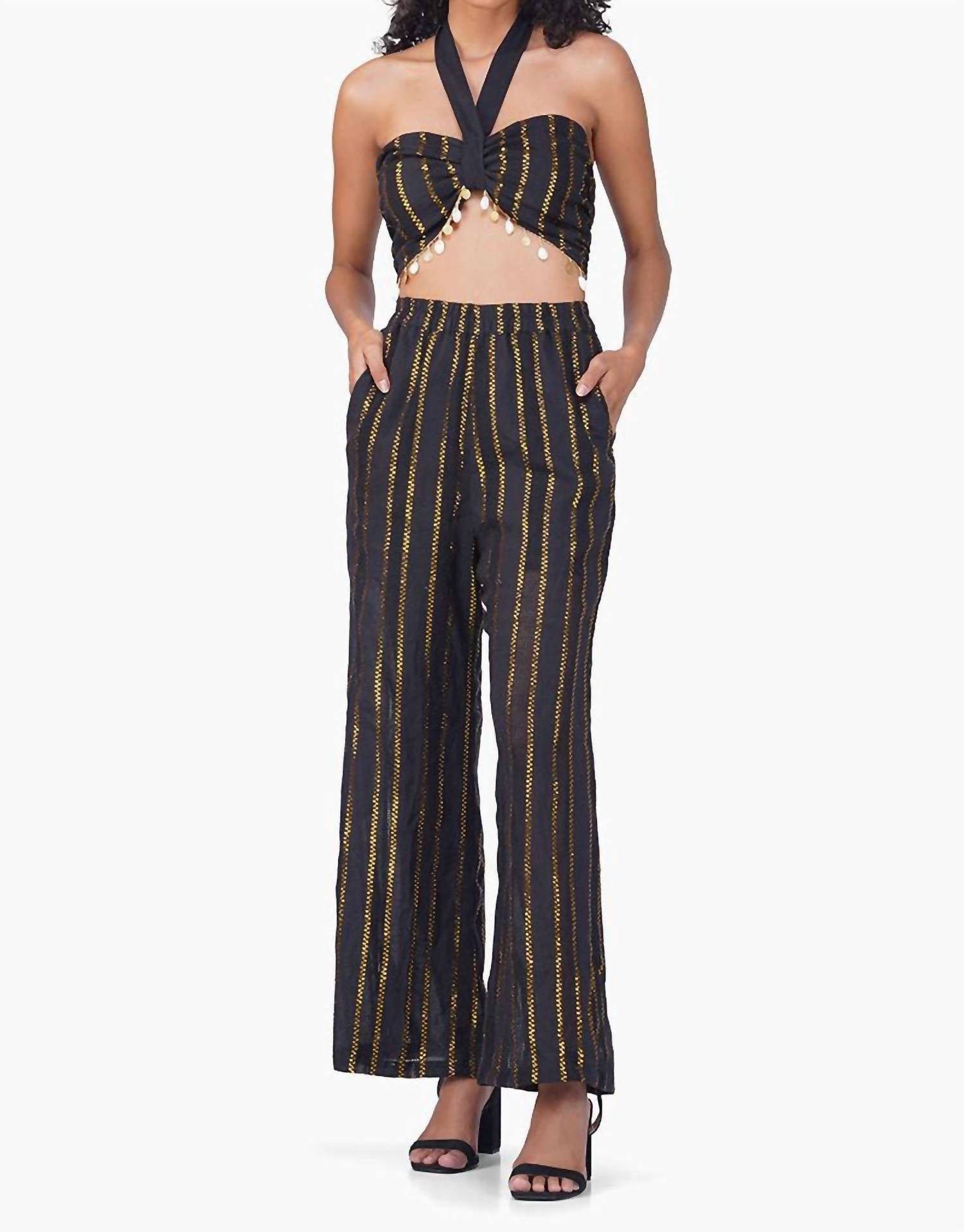 A match made in heaven. This two-piece set is so cute, you'll wish you could wear it out of the house! Did we mention how comfortable it is, too? You may want two sets! Introducing the Midnight Tide Set by AMERICA & BEYOND, a stylish and comfortable set in sophisticated black. This set features a strapless crop top and straight-cut pants, both crafted from luxurious cotton with a gold lurex stripe pattern. The top includes a tie closure for adjustable fit and front shell lace detailing, perfectly complemented by the back smocking for added comfort. Enhance your wardrobe with this elegant set that combines practicality with machine wash care, ready for both casual lounging and stylish outings.