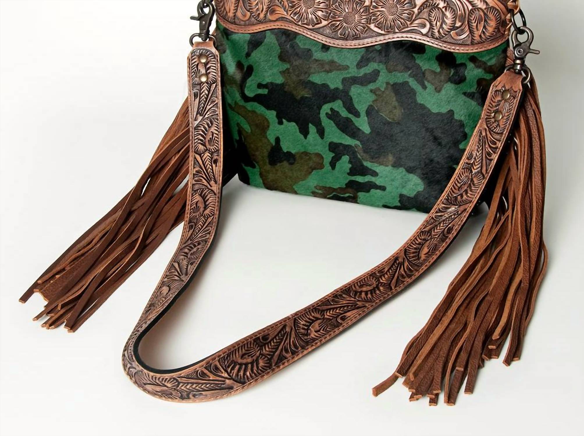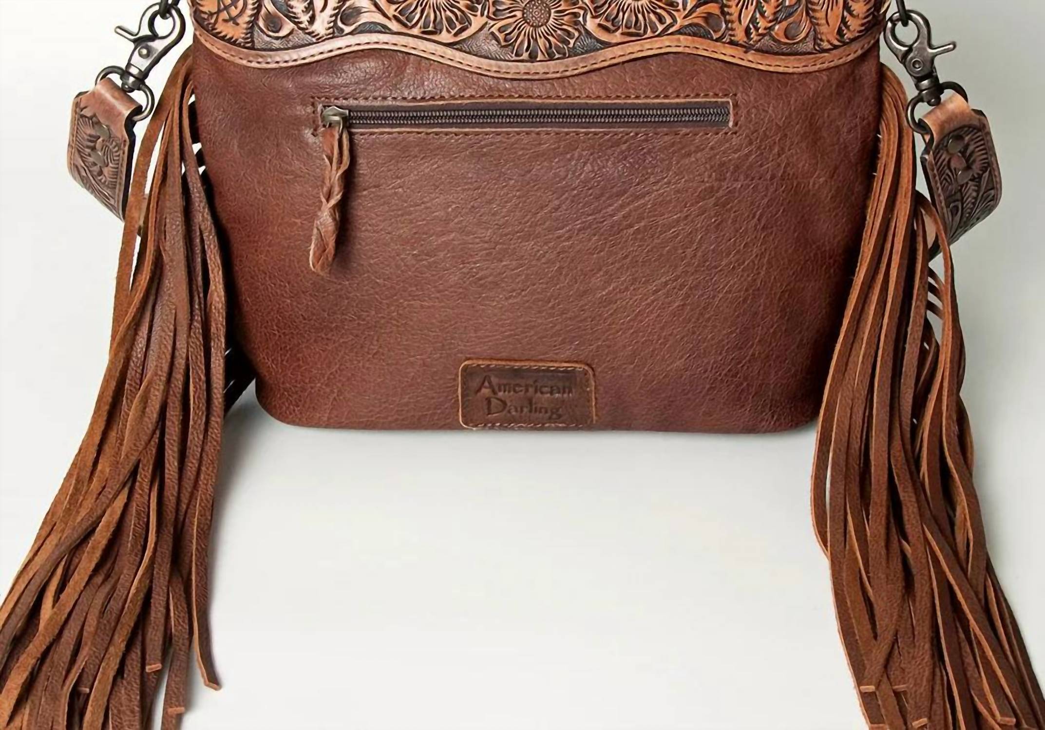 Discover the Women's Clutch Crossbody Bag by American Darling, a stunning piece crafted from genuine full-grain leather known for its softness and durability. Featuring detailed hand-tooling on vegetable-tanned American cowhide, this bag boasts an adjustable shoulder strap with hand-tooled patterns for a distinctive western style. It includes beautiful leather fringes and highly durable solid antique finish metal fittings, ensuring a refined look. The dependable YKK zipper closures secure all your essentials, and the bag measures 12 inches in height by 14 inches in width.