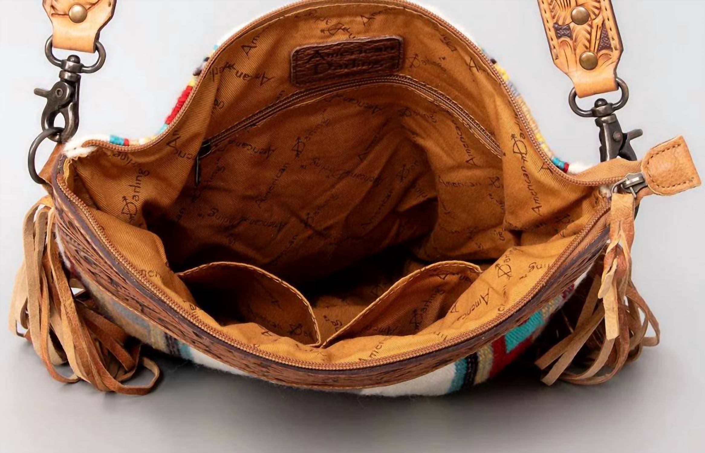 Introducing the Women's Large Crossbody Messenger Bag by American Darling, a masterpiece of craftsmanship in multi-color. This bag features meticulously hand-tooled and carved details on genuine full-grain leather, enriched with a hand-weaved wool saddle blanket for a trendy yet traditional look. It includes an adjustable leather strap with hand-tooled patterns and is adorned with elegant leather fringes, adding a distinctive western flair. Secured with durable YKK zippers and antique-finish metal fittings, the bag provides longevity and style. Size: 15in (H) X 15in (W) X 3in (D).