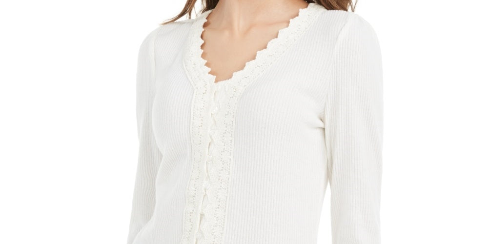 Fitted silhouette|V-neck; front button closures|Lace trim; rib-knit fabric|Long sleeves with button cuffs