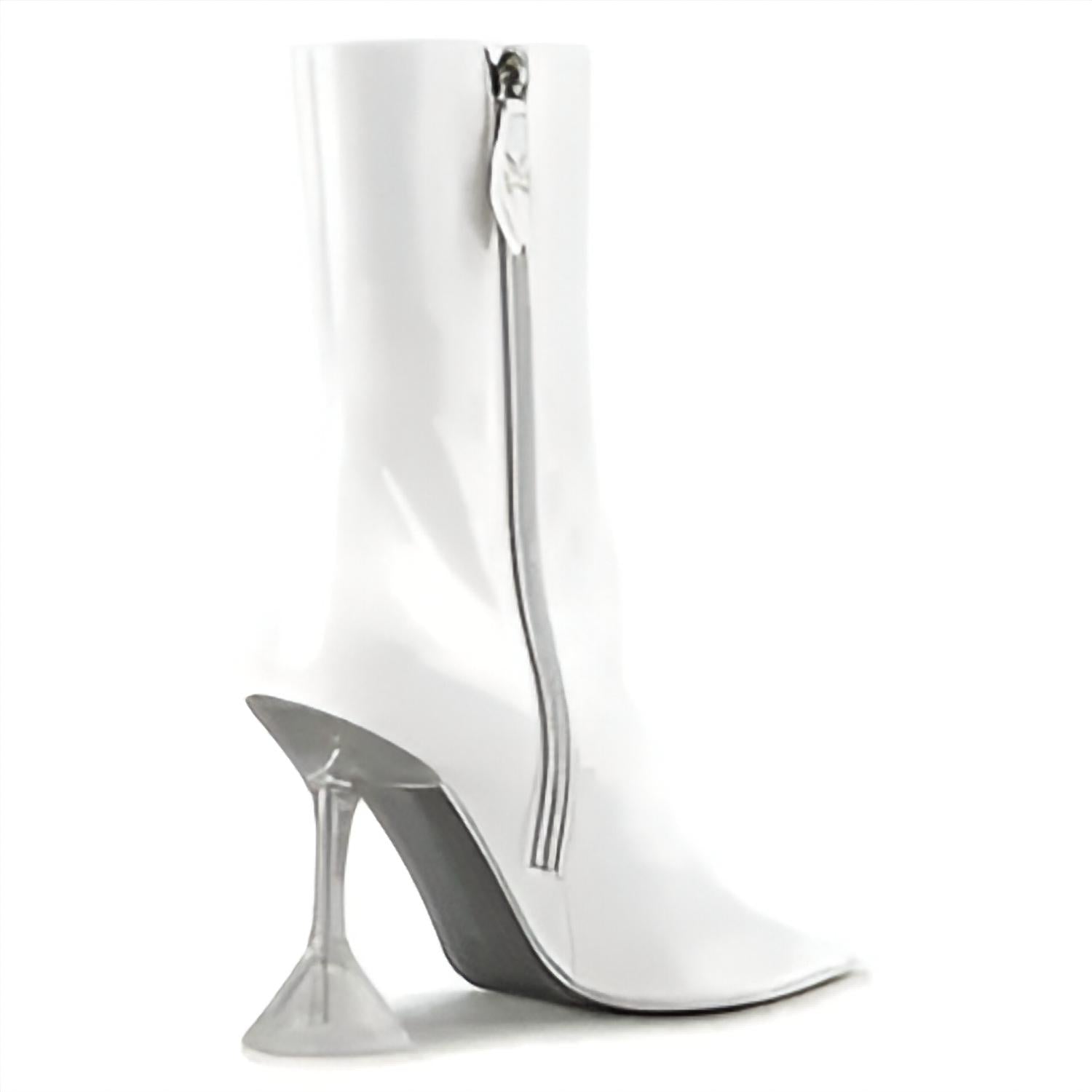 Step out in confidence and showcase your impeccable taste with these fashionable and versatile boots. Their classic style will have you reaching for these boots season after season. Step confidently into any holiday party with the Women's Giorgia Croc Leather Mid-calf Boots by AMINA MUADDI, crafted from 100% Nappa leather. These chic white boots feature a sleek pointed toe and a brand leather insole for a sophisticated appearance. The 3.75" clear plexi martini heels add a unique twist to the minimalist design, while the interior side zipper closure with silver hardware ensures a snug fit. Proudly made in Italy, these boots promise both style and quality.