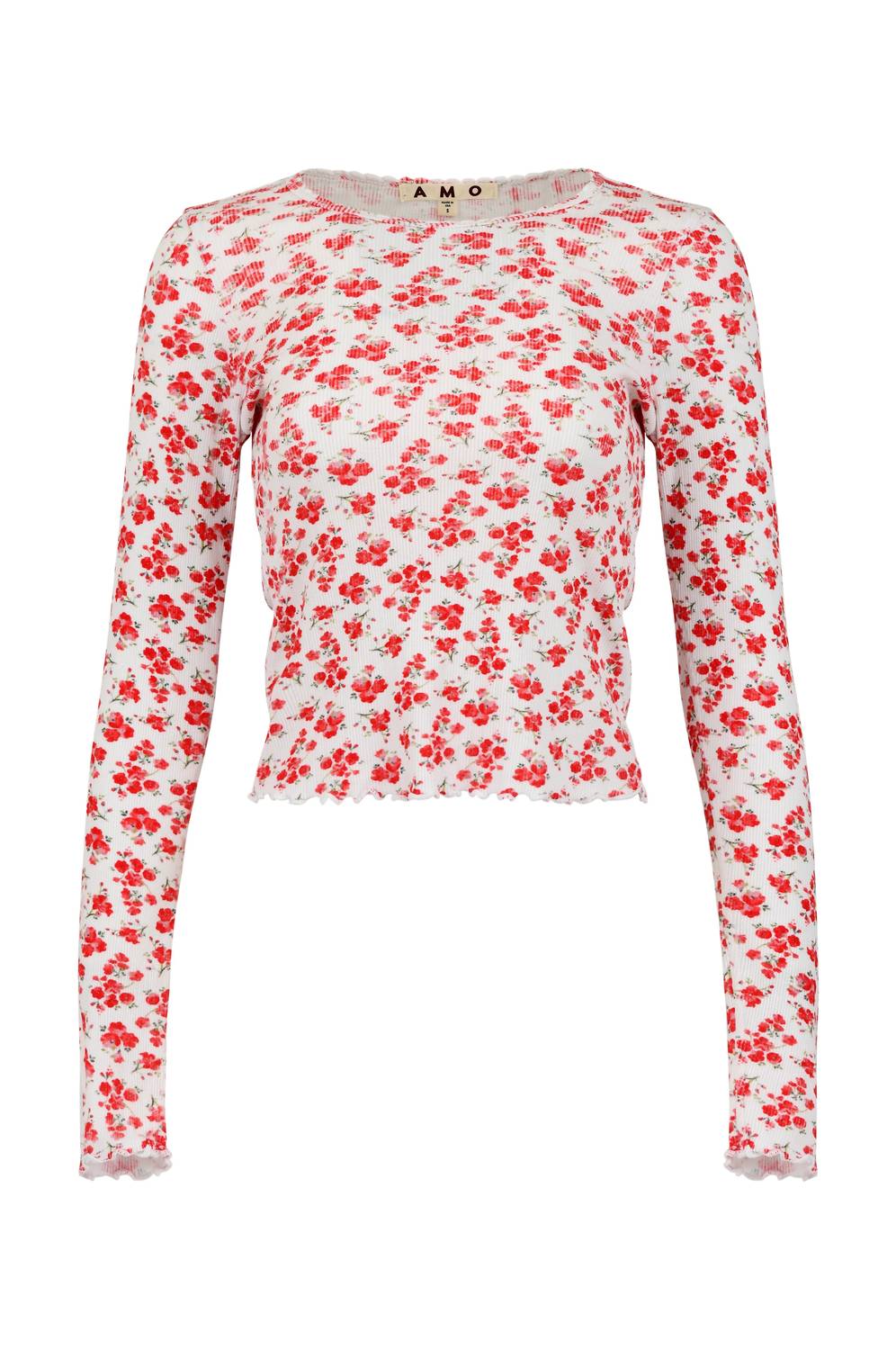 A long sleeve top you can wear with denim, skirts, well... just about anything! Presenting the AMO Women's Tori Tee in Ditsy Floral, a perfect blend of feminine charm and classic style. This long sleeve tee is crafted from 100% cotton, showcasing an allover vintage-inspired floral print. Made to perfection in Los Angeles, it features delicate lettuce-edge hems and a cropped fit, measuring 21" in length with a 27" chest. Closure: Pull on. Care: Machine wash cold, line dry. Ideal for pairing with high-rise denim for a chic, minimalist look.