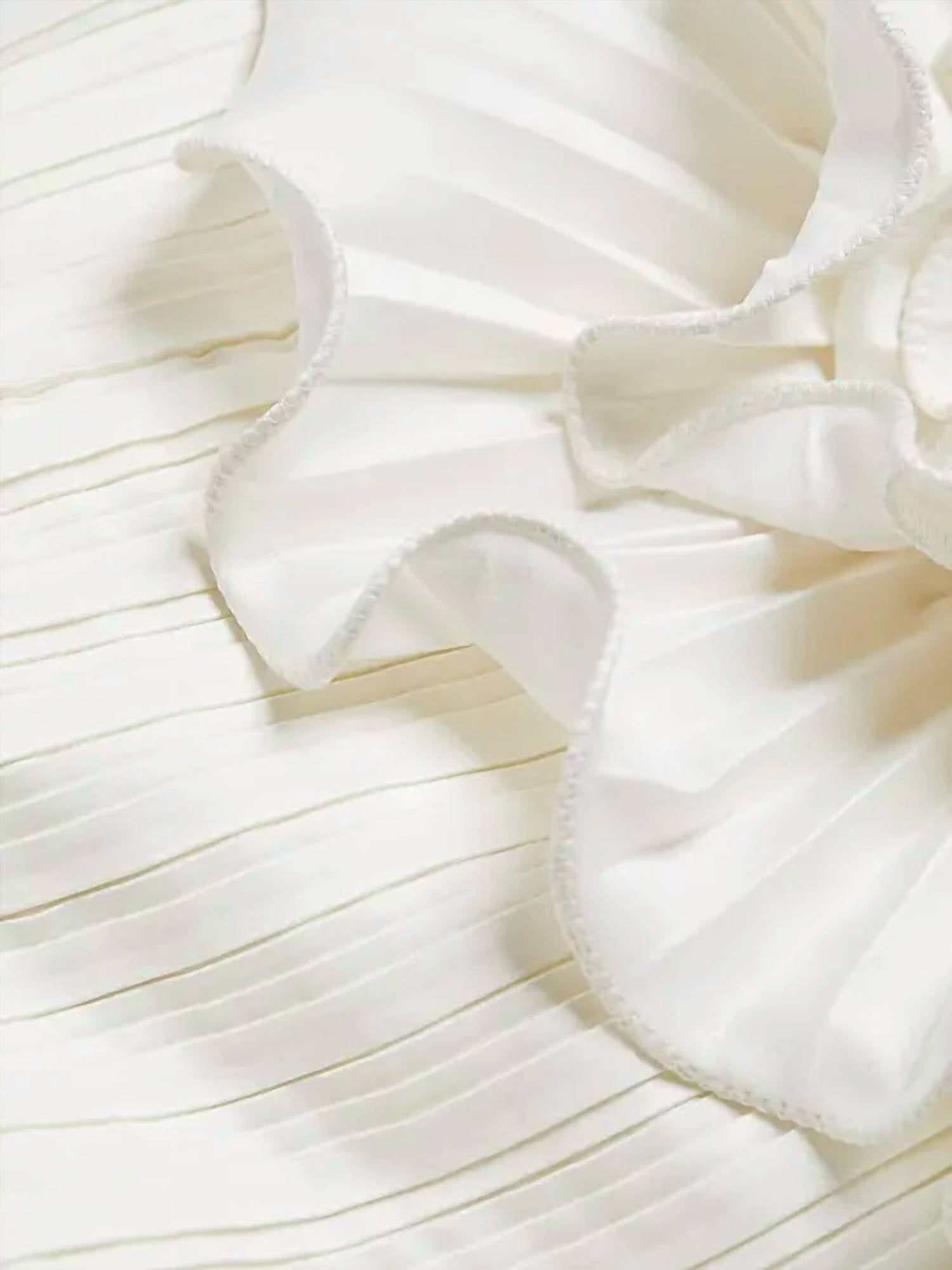 The Isla Ruffle-trim Minidress by AMUR in an elegant ivory hue is perfect for making a statement. This strapless, solid-patterned bodycon minidress features a ruffled hem and a sophisticated rosette detail, enhanced by stitched horizontal pleating. It is skillfully crafted from 100% polyester with a comfortable lining of 97% polyester and 3% spandex. Made for a sleek silhouette, the dress offers a concealed side zip closure and is about 35 inches from bust to hem. Designed to fit snugly, dry clean only. Model is 5'10” and wears a US size 4.