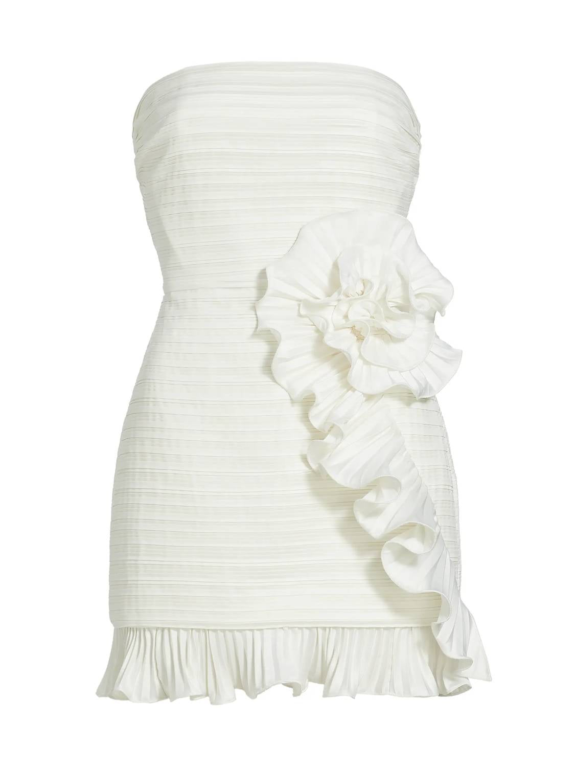 The kind of easy and flattering dress you'll be reaching for all season long. The Isla Ruffle-trim Minidress by AMUR in an elegant ivory hue is perfect for making a statement. This strapless, solid-patterned bodycon minidress features a ruffled hem and a sophisticated rosette detail, enhanced by stitched horizontal pleating. It is skillfully crafted from 100% polyester with a comfortable lining of 97% polyester and 3% spandex. Made for a sleek silhouette, the dress offers a concealed side zip closure and is about 35 inches from bust to hem. Designed to fit snugly, dry clean only. Model is 5'10” and wears a US size 4.
