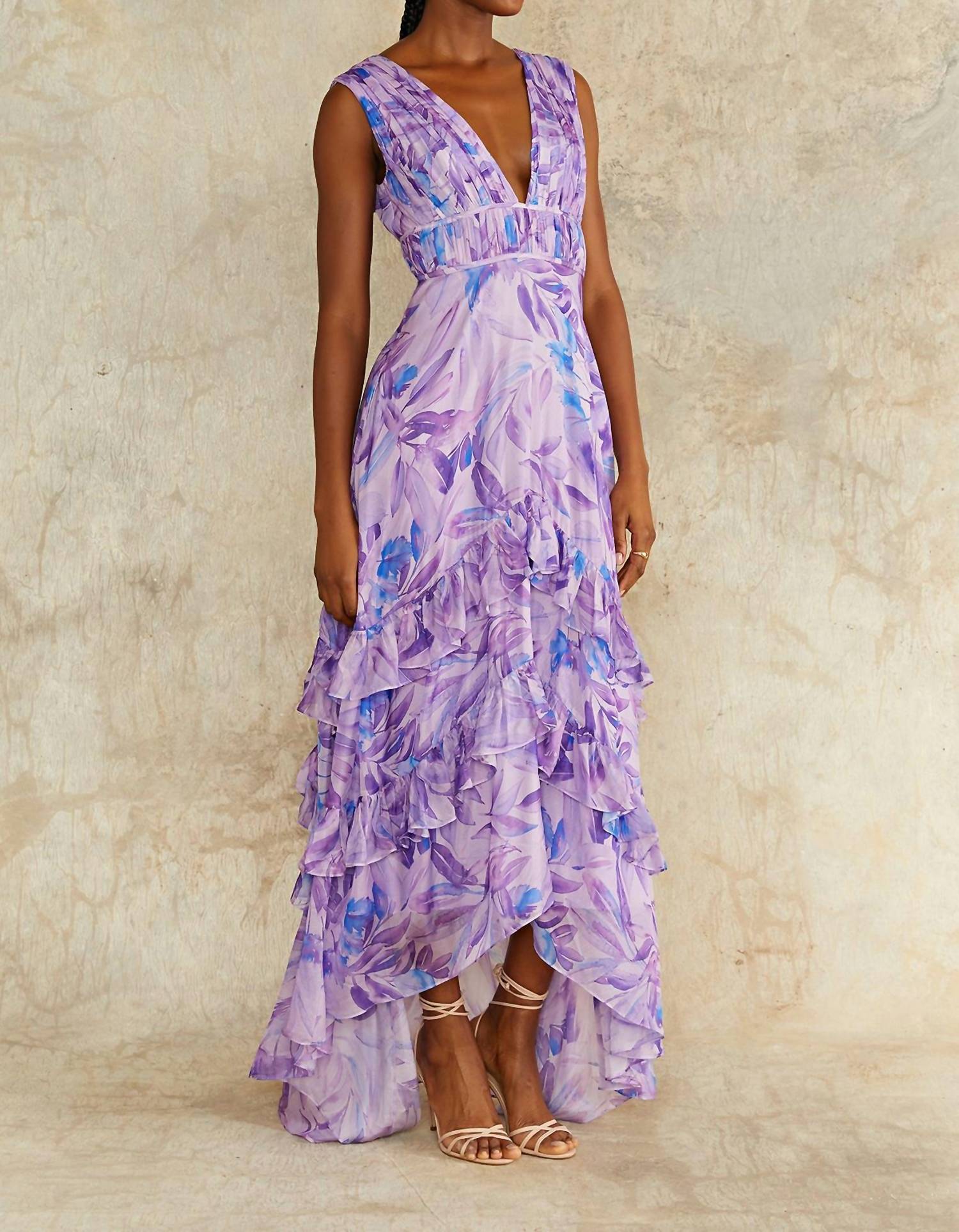 Style this maxi with your favorite statement necklace and sandals for the perfect look. Introducing the Women's Senora High Low Gown by AMUR, perfect for making a statement on your next vacation. This Sleeveless gown in an eye-catching Lavandula Palms pattern features a V-neck and a chic high-low hem that exudes elegance. Made from a quality Viscose Blend, it boasts a maximalist A-line silhouette that flows beautifully. The pull-on closure ensures ease of wear, ideal for those summer days when you want to blend comfort with style.