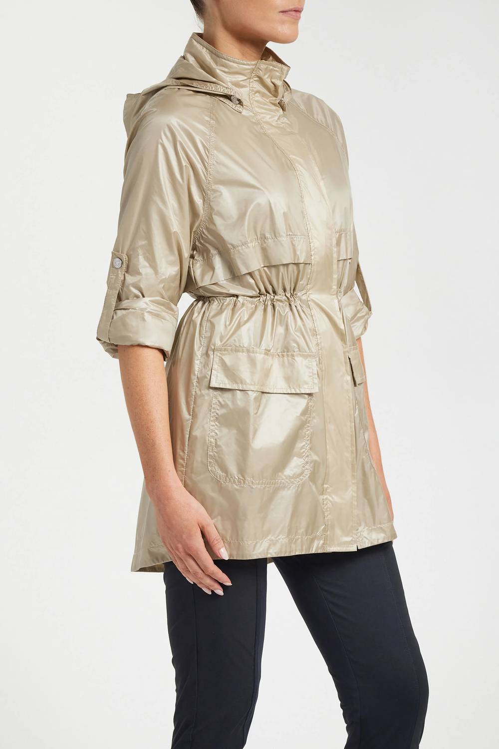 The coolest, most versatile utility jacket. Match it with your favorite pair of denim or throw it over any day dress. Relaxed fit with an adjustable drawcord cinched waist, high collar, and long sleeves with button cuffs and tabs for adjustable sleeve length. Features a detachable hood, zip front with snap placket, two front patch pockets with flaps, and is wind resistant. Model is 5'10" wearing size SM. Machine wash cold. 100% Nylon,