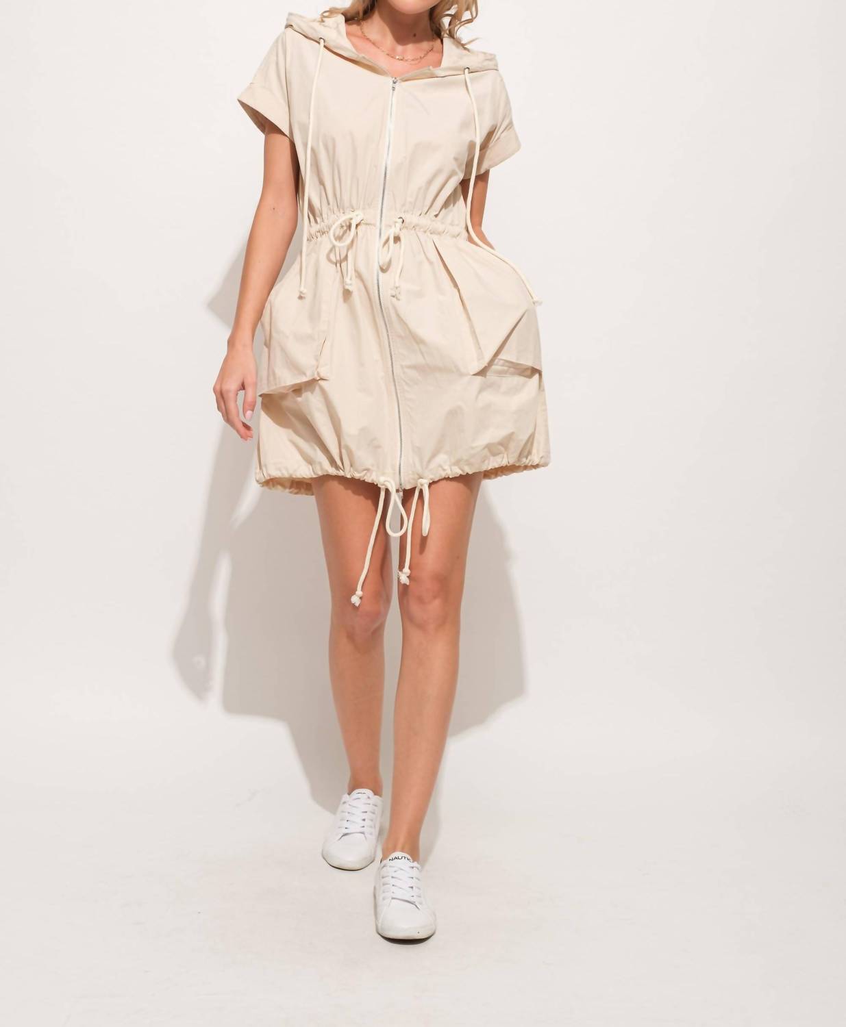 Introducing the Short Sleeve Drawstring Hooded Mini Dress by And The Why, a chic addition to your spring wardrobe in a solid almond hue. This streetwear-inspired piece features short sleeves and a practical zip closure, perfectly designed with pockets and a drawstring waist, hemline, and hood. Made from 100% polyester, this dress represents comfort and vacation-ready style. Easy to care for, simply machine wash and tumble dry.