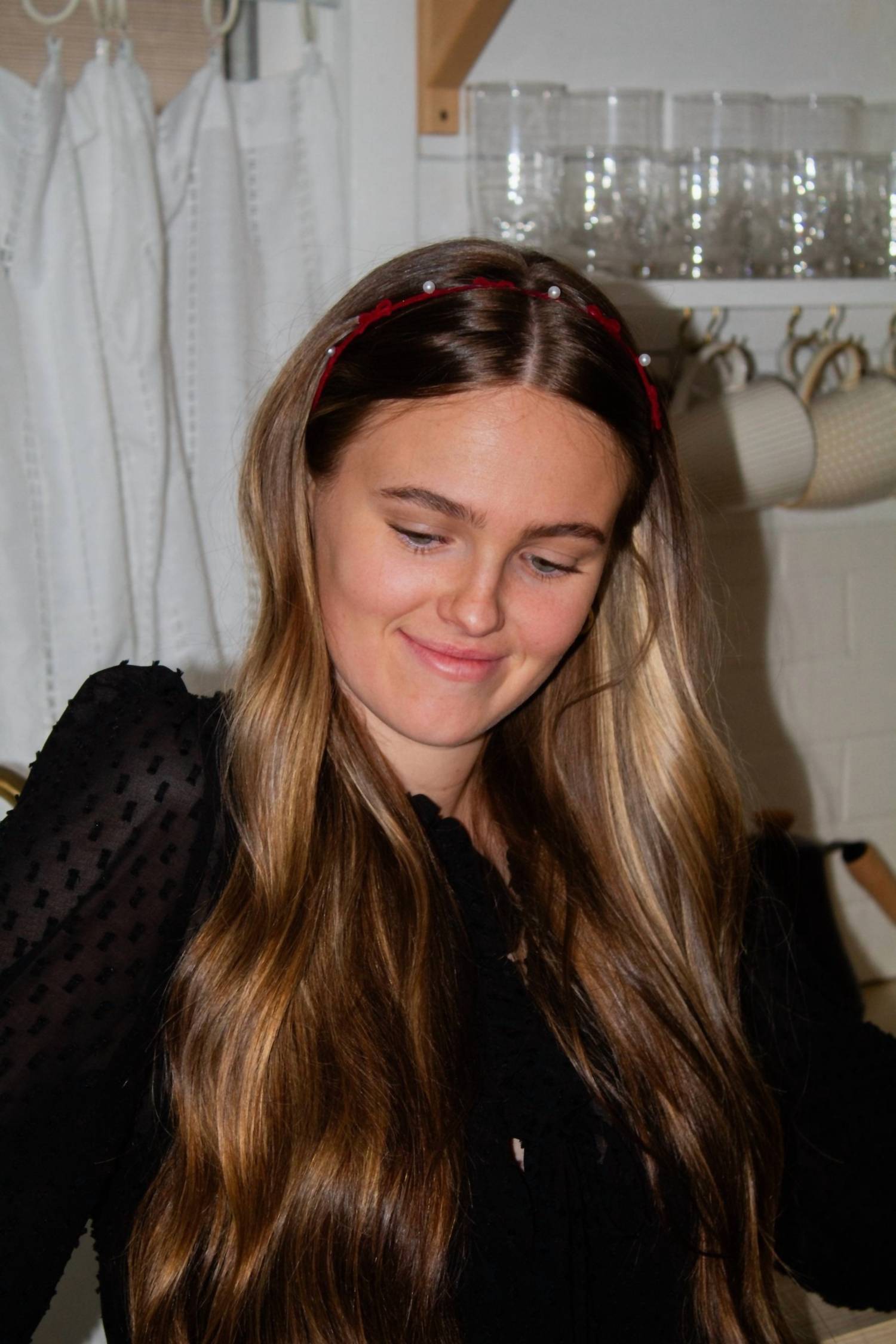 Elevate your hair game with the Women's Velvet Bow And Pearl Headband by ANDI, designed to add a touch of sophistication to any look. Crafted from luxurious velvet, this thin, hard band features four charming velvet bows each adorned with a delicate pearl, making it the perfect accessory for any occasion. Material: Velvet.