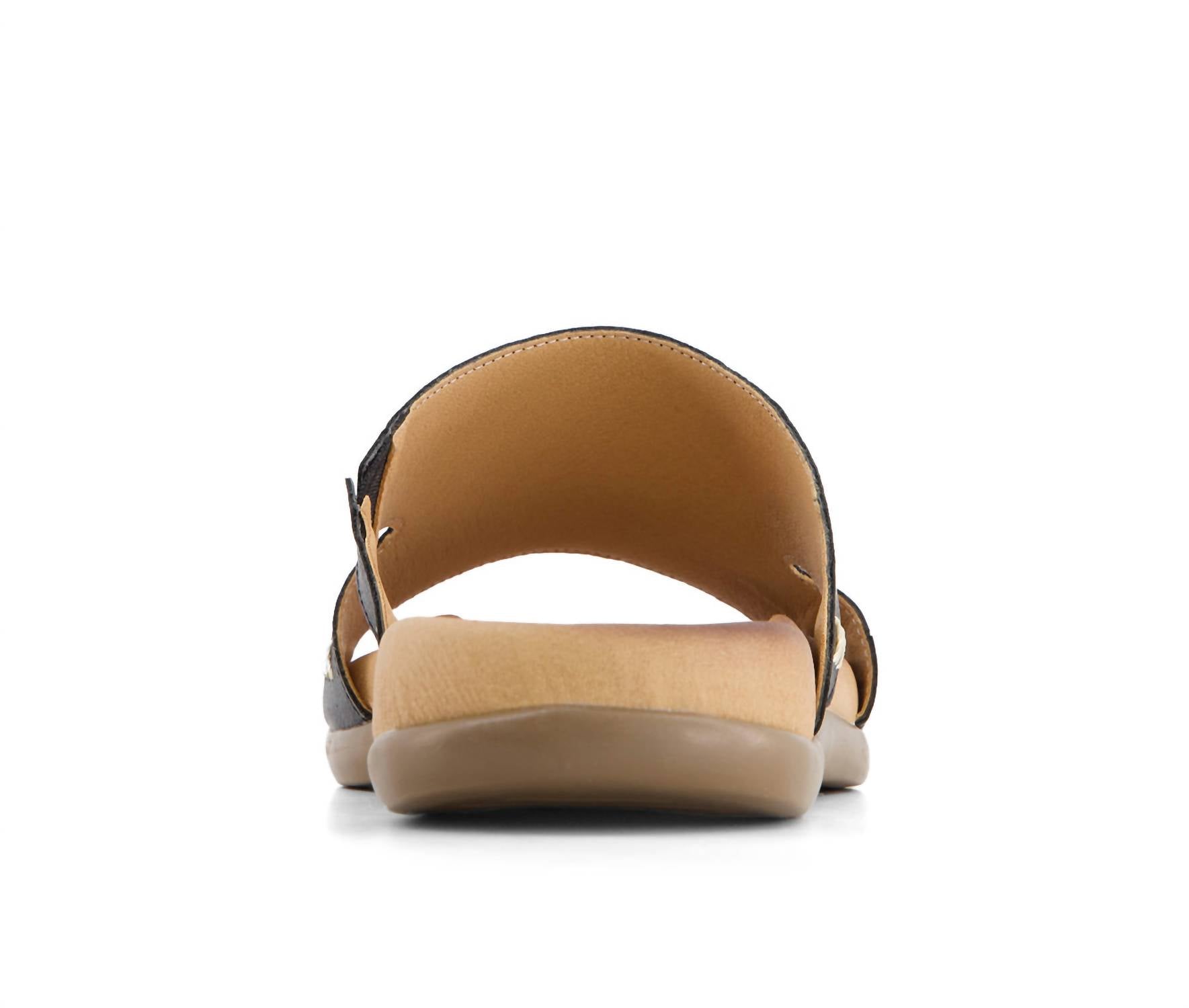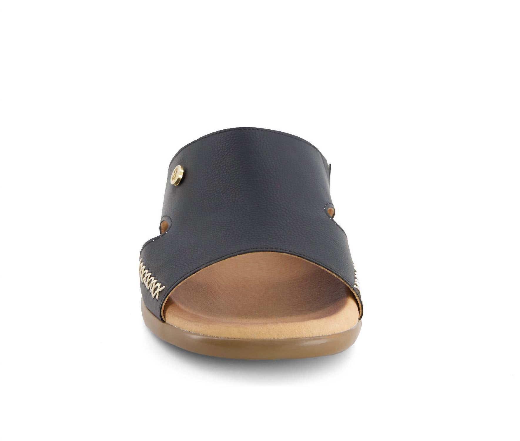 This sandal will take you from brunch to dinner and everything in between. Step into effortless style with the Women's Slip On Sandals by Andrea, designed with a sleek black faux leather upper. These sandals offer a trendy open toe style with a flat heel, perfect for both workwear and vacation settings. The durable non-slip rubber sole is combined with a memory foam comfortech insole, ensuring all-day wearability. Ideal for the fashion-forward woman seeking comfort without compromising on style.