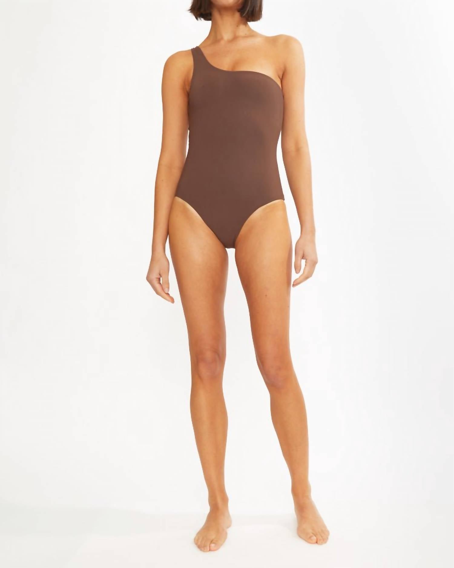 Introducing the One Shoulder One Piece by ANEMOS, a chic swimwear option in a sophisticated Moka shade for your summer beach days. This high-rise one-piece features an asymmetrical neckline, providing a stylish twist on a classic silhouette. Crafted from 72% Polyamide and 28% Elastane, it's UV protected with UPF 50+ and fully lined for added comfort. Care instructions are simple with a machine wash cold recommendation, ensuring maintenance-free wear.