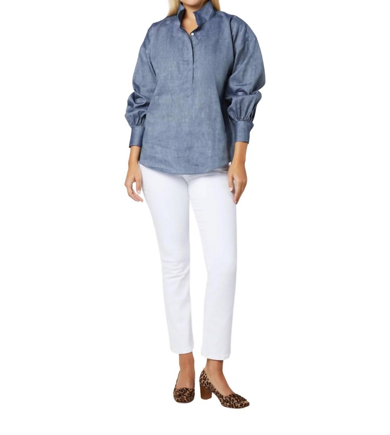 A long sleeve top you can wear with denim, skirts, well... just about anything! Meet the Anaya Popover Shirt by Ann Mashburn, a chic addition to your summer wardrobe in a rich indigo cotolino chambray. This women's top features three-quarter sleeves and a stylish stand collar for a relaxed yet polished look. Made from a linen blend, it's designed with a convenient button closure and a flattering 22-inch length. Care: Machine wash. Perfect for vacation days, its solid pattern aligns with the monochrome trend.