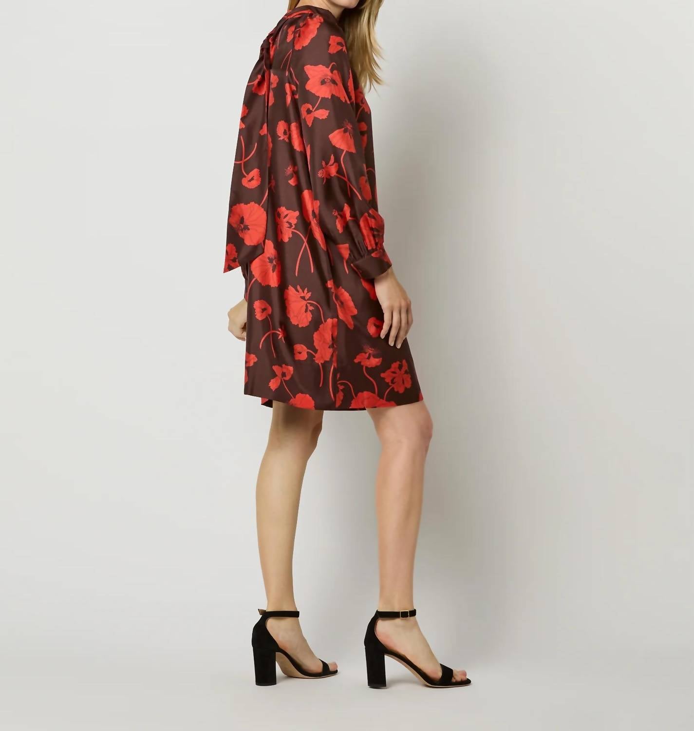 The perfect mini dress for those warmer months. Discover the Maggie Dress by Ann Mashburn. An elegant choice for any holiday party this fall. Made from luxurious silk, this mini dress showcases a sophisticated long sleeve design with a flattering shift silhouette. Featuring a whimsical floral print in Chocolate Spice Fragile Bloom, it sports a mock-neck and a versatile tie closure at the back. The dress is made in Spain and includes thoughtful details like pockets; it requires dry cleaning to maintain its beauty.