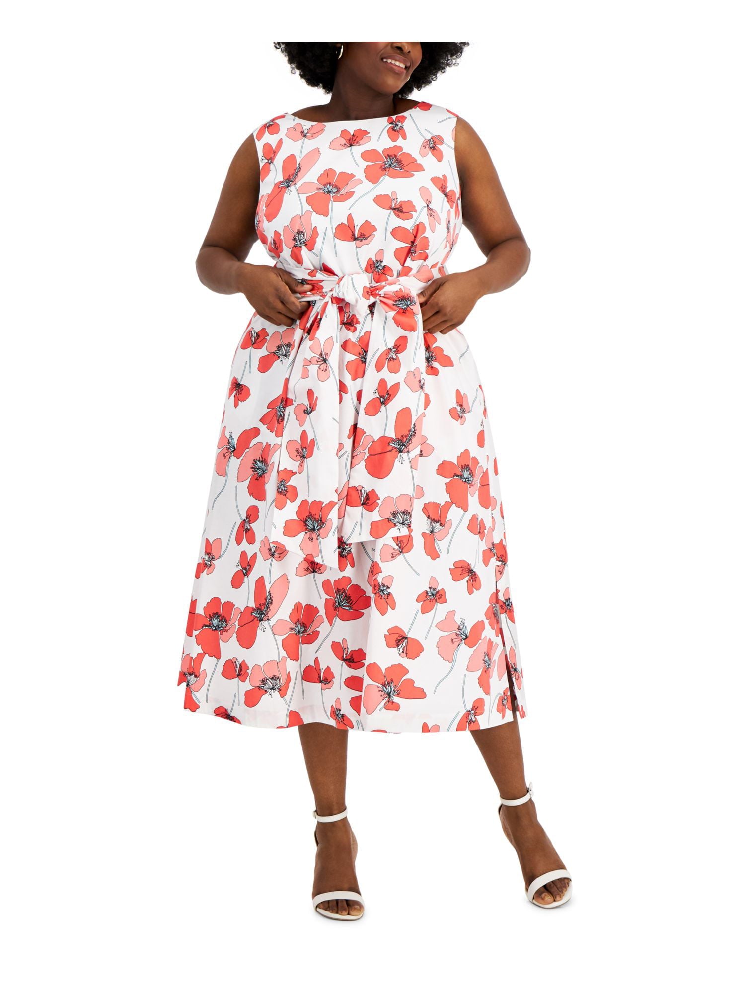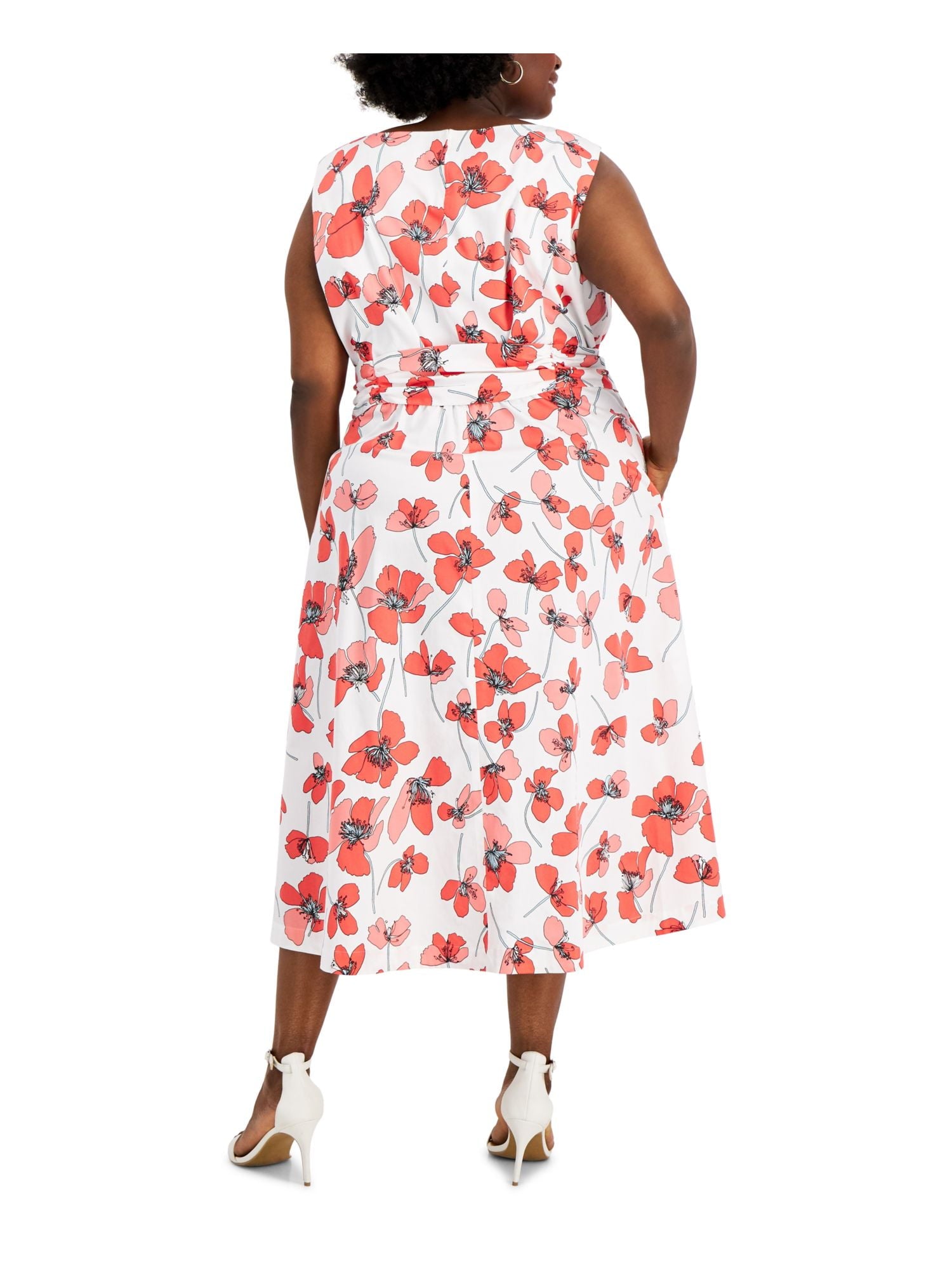 Anne Klein Women's Pocketed Tie Front Slit Hems Lined Floral Sleeveless Round Neck Midi Wear To Work Fit Flare Dress Plus Red Size 1X