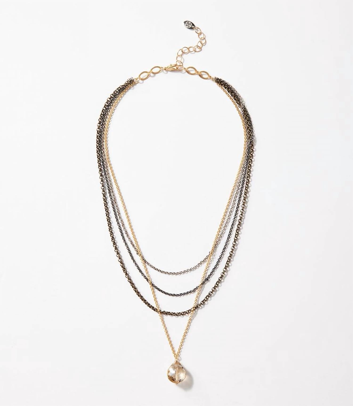 Layer this necklace or wear it on its own. Either way it's a win-win. Discover the Crystal Multistrand Necklace by Anne Vaughan, a stunning addition to any ensemble in a chic goldtone hue. Elevate your style with its mixed metal chains and smokey quartz charm, providing a sophisticated layered look effortlessly. Product dimensions include a 17" length and a 3.5" extender with a pendant size of approximately 0.9". Closure: Lobster clasp. Made in the USA.