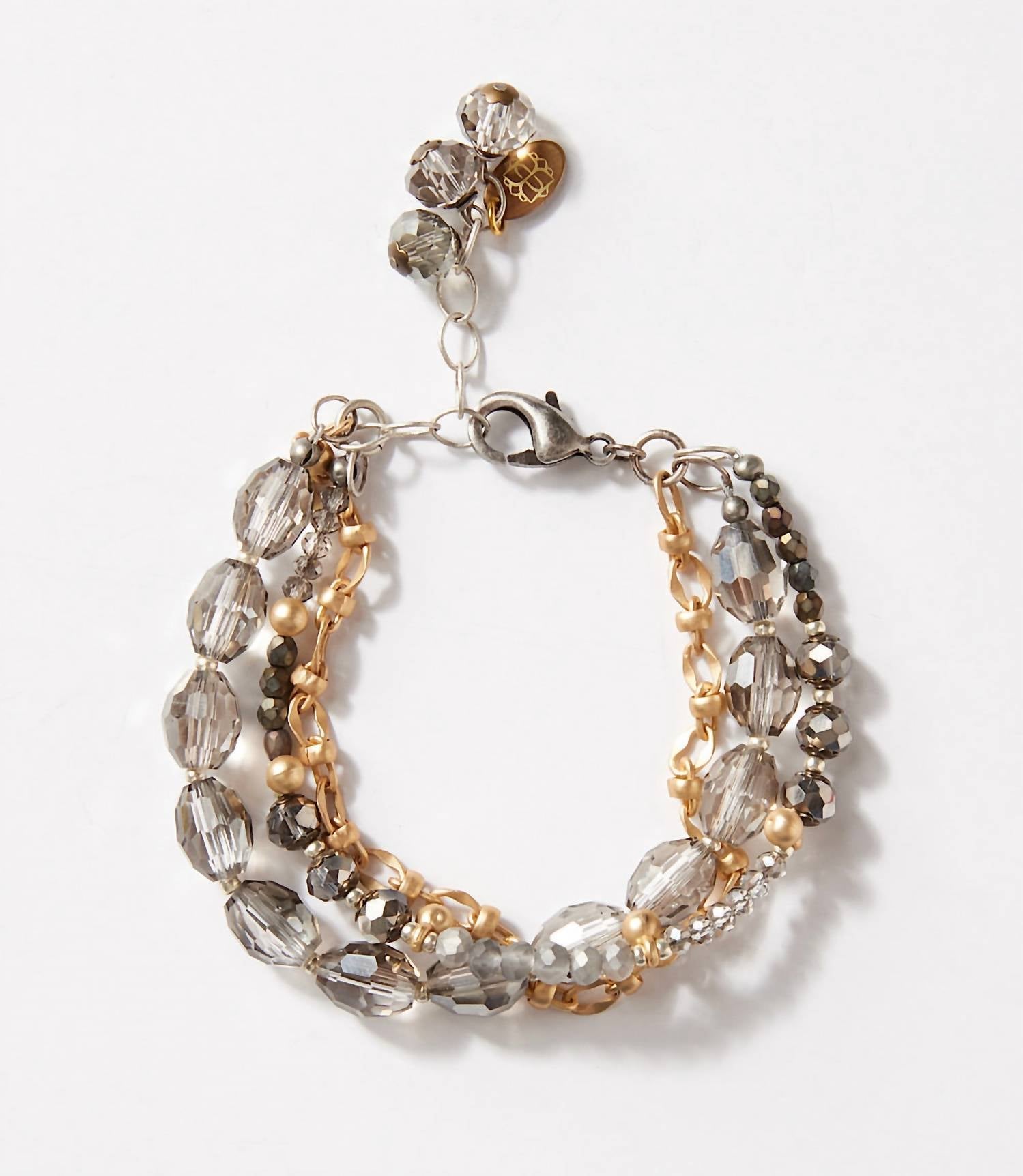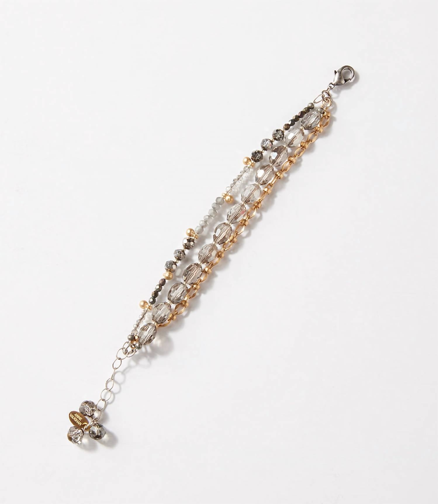 This stand-out bracelet is good enough to wear on its own, or stacked with your favorites. Introducing the Women's Multistrand Crystal Bracelet by Anne Vaughan, a captivating piece designed to add elegance to any attire. This bracelet features three strands of smokey quartz, grey crystals, and a gold chain link, creating a stunning layered effect. Made in the USA, it measures 7.25 inches in length with a 1-inch extender and weighs just 0.70 oz. Perfect for effortlessly enhancing your look with a hint of sparkle.