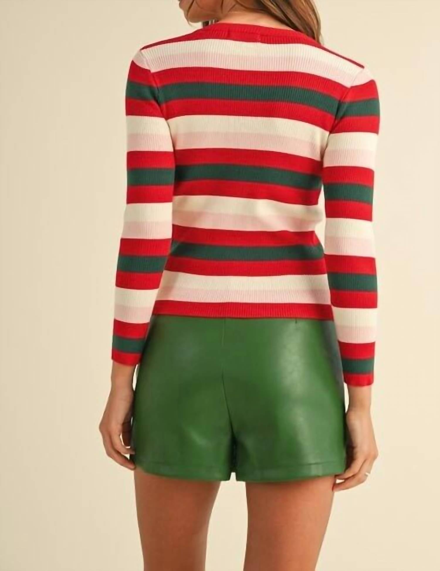 Great fit, cute design, soft fabric. You'll love everything about this long sleeve tee. Introducing The Carol Striped Ribbed Top by AnnieWear, a festive addition to your holiday wardrobe. This fun and playful top features long sleeves and a ribbed design with vibrant multi-color stripes in red, green, and white. Made from a blend of 50% Viscose, 28% Polyester, and 22% Nylon, it offers a comfortable and form-fitting look. Closure: Button closure with a stylish Henley neck accentuated by three pearl buttons.