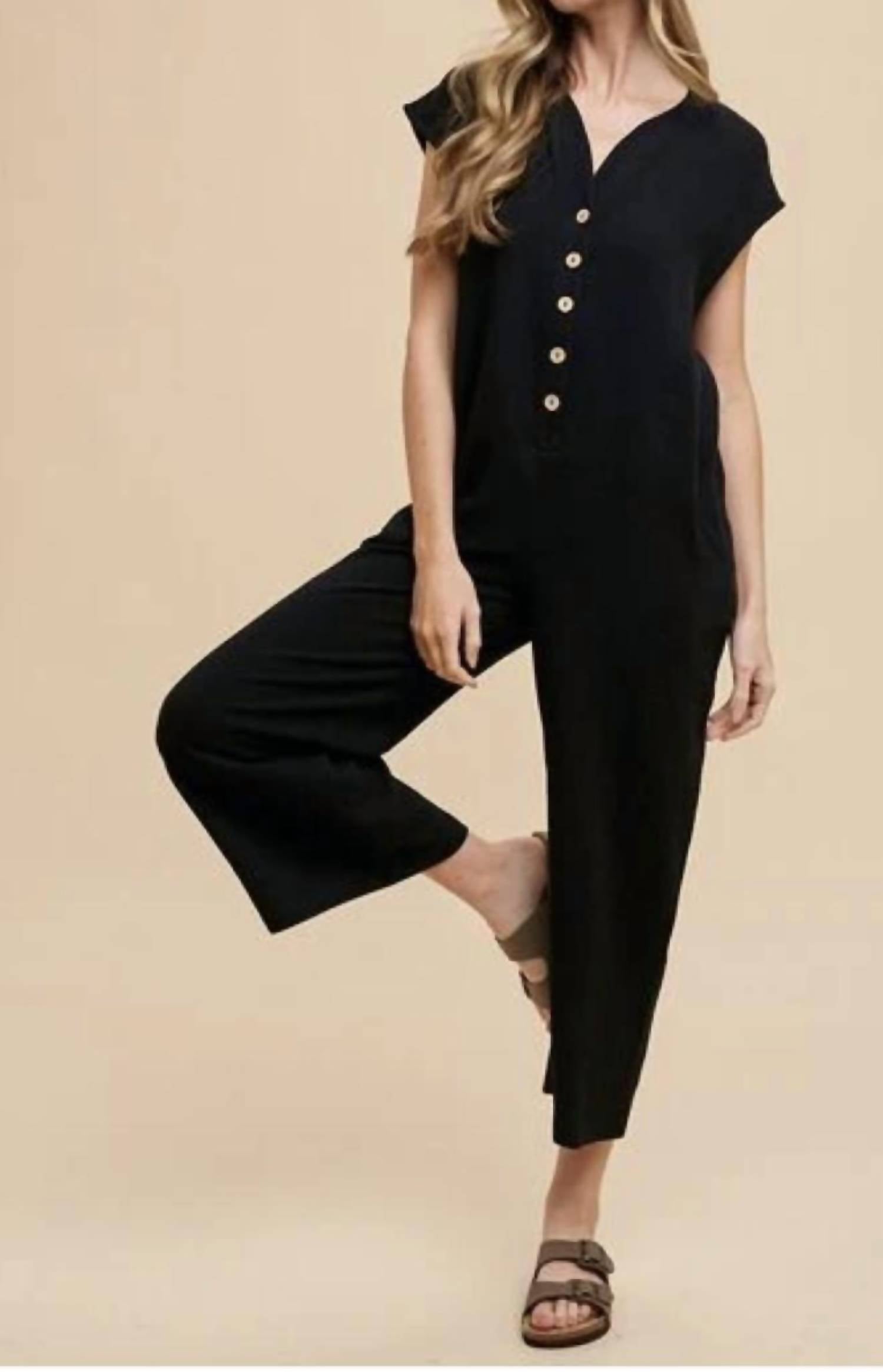 It doesn't take much for this one piece to look effortlessly cool. Add some statement jewelry to dress it up, or throw on some sneakers for a more casual vibe. Introducing the Cotton Gauze Button Down Jumpsuit by AnnieWear, designed for a comfortable yet stylish fit in classic black. This women's jumpsuit features a button-down front and a flattering V-neck silhouette. Made from breathable cotton, it offers a solid pattern and convenient pockets for everyday functionality. Care: Hand wash and lay flat to dry for best results.