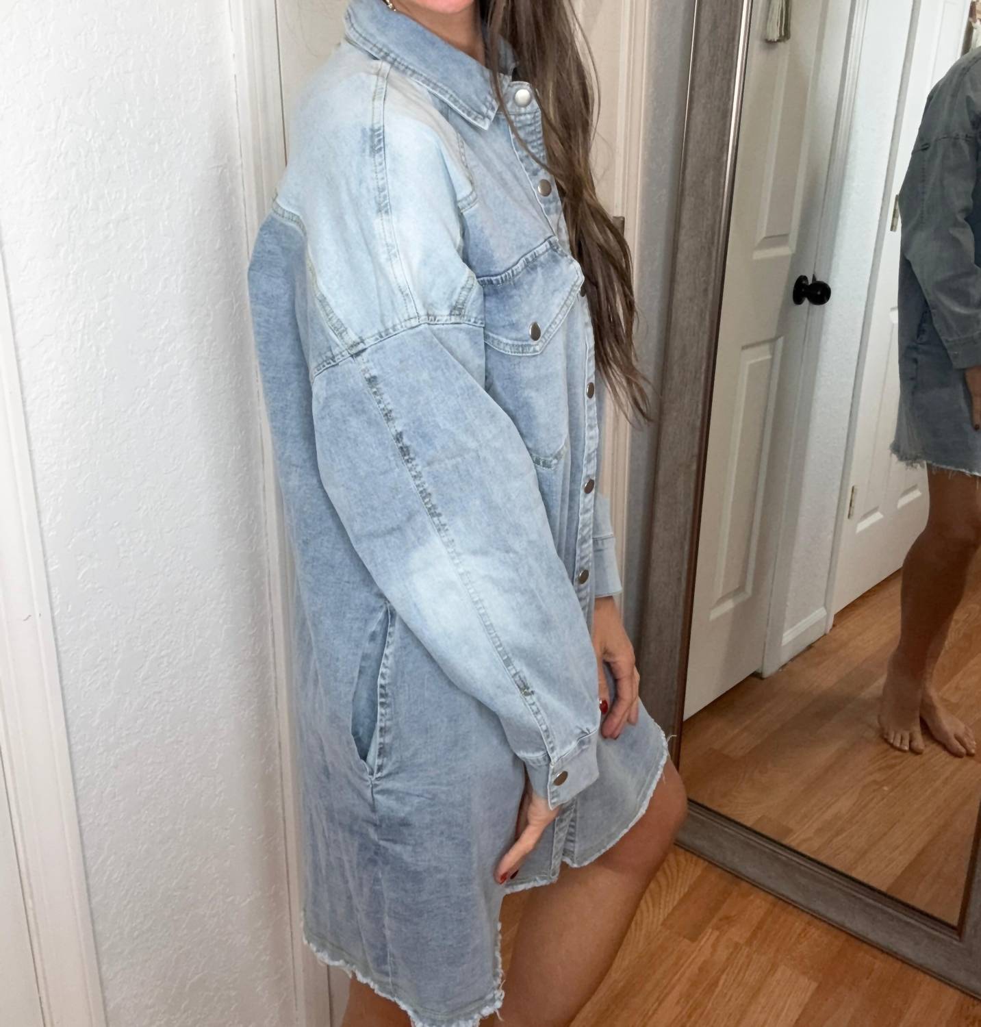 The AnnieWear Darla Button Down Shirt Dress in light denim offers effortless chic with its long sleeves and classic collar. Made from 75% cotton, 22% polyester, and 3% spandex, this 35-inch dress provides a relaxed, oversized fit perfect for travel or streetwear seasons. Featuring pockets and a snap button closure, this dress transitions seamlessly from casual to dressed-up occasions. Machine wash for easy maintenance.
