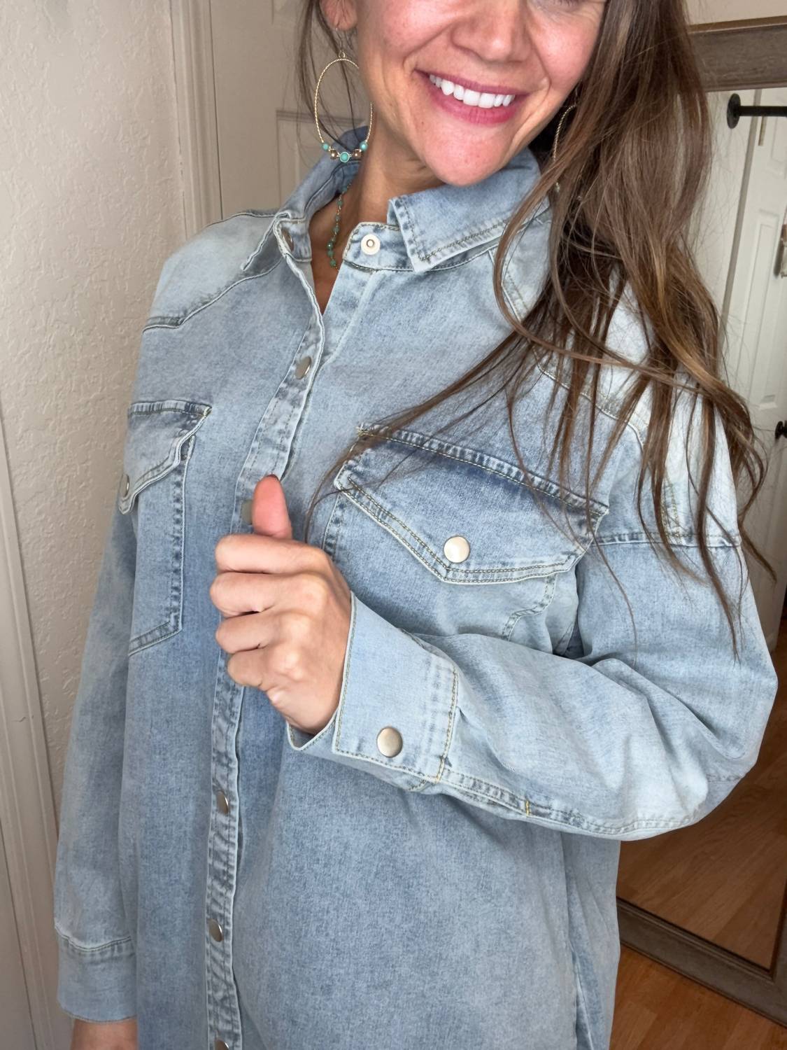 Cute and comfortable, this long sleeve dress has it all. The AnnieWear Darla Button Down Shirt Dress in light denim offers effortless chic with its long sleeves and classic collar. Made from 75% cotton, 22% polyester, and 3% spandex, this 35-inch dress provides a relaxed, oversized fit perfect for travel or streetwear seasons. Featuring pockets and a snap button closure, this dress transitions seamlessly from casual to dressed-up occasions. Machine wash for easy maintenance.