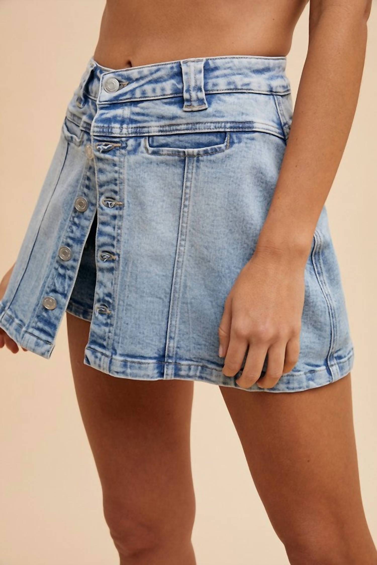 Meet the Katelyn Button Mini Skort by AnnieWear, a chic addition to any wardrobe in a solid denim color. Crafted from a stretchy cotton blend with an elegant button closure, this women's skort blends comfort and style seamlessly. The mini length and asymmetrical wrap design, complemented by decorative seams and pockets, make it a versatile choice for various occasions. Machine wash and tumble dry. 98% Cotton 2% Polyester.