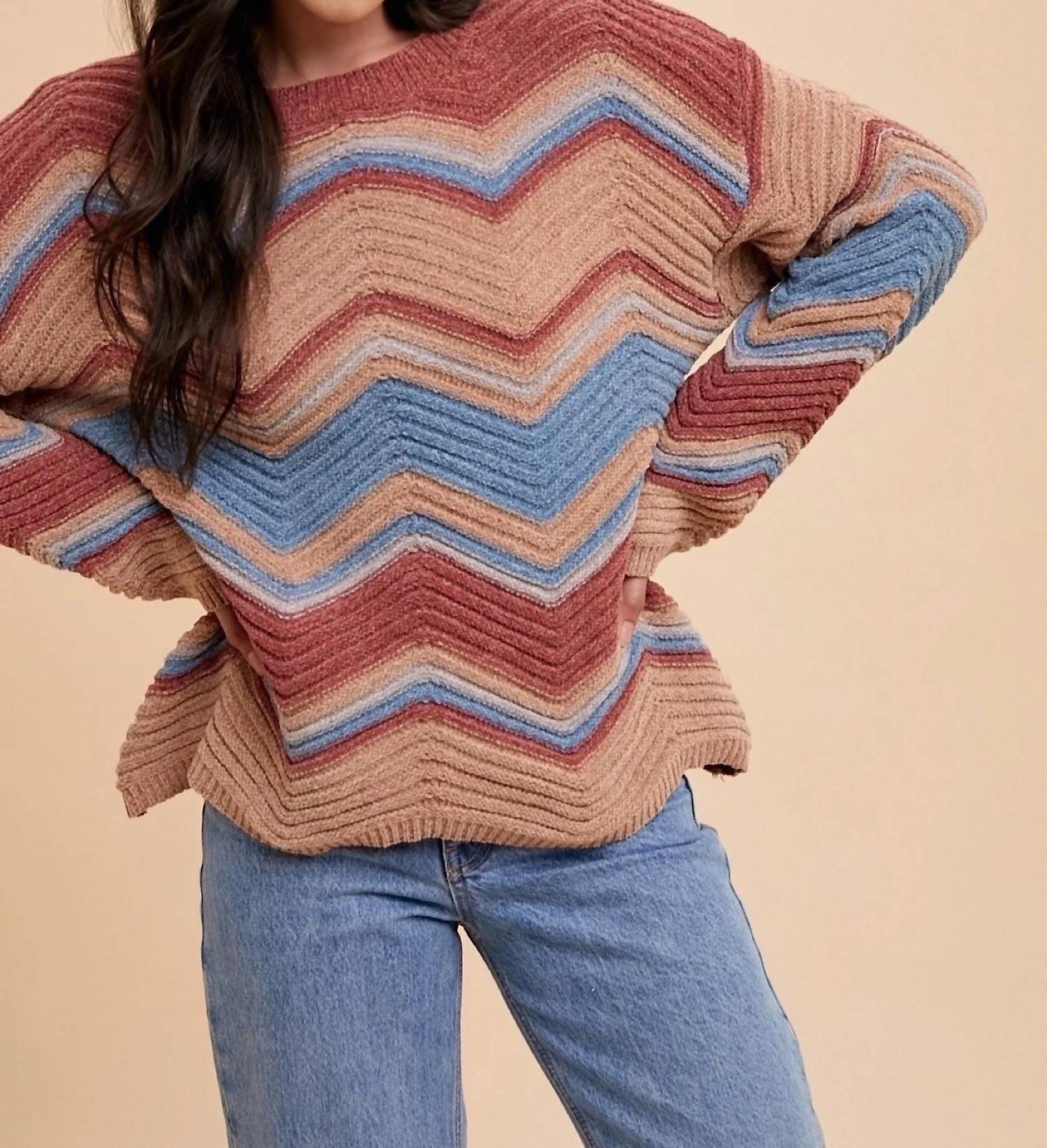 The ultimate go-to sweater, expertly crafted to provide the perfect combination of warmth and style. Its classic design and soft fabric make it a must-have addition to your wardrobe. Elevate your wardrobe with the Rose Chenille Sweater by AnnieWear, a beautifully soft piece designed for ultimate comfort. This long sleeve sweater features a contemporary zig-zag design that extends to the hem and wrists, complete with subtle zig-zag cutouts. Crafted from 100% polyester, it offers a convenient pull-on closure. For care, simply hand wash and lay flat to dry. Available in sizes S, M, L, and XL.
