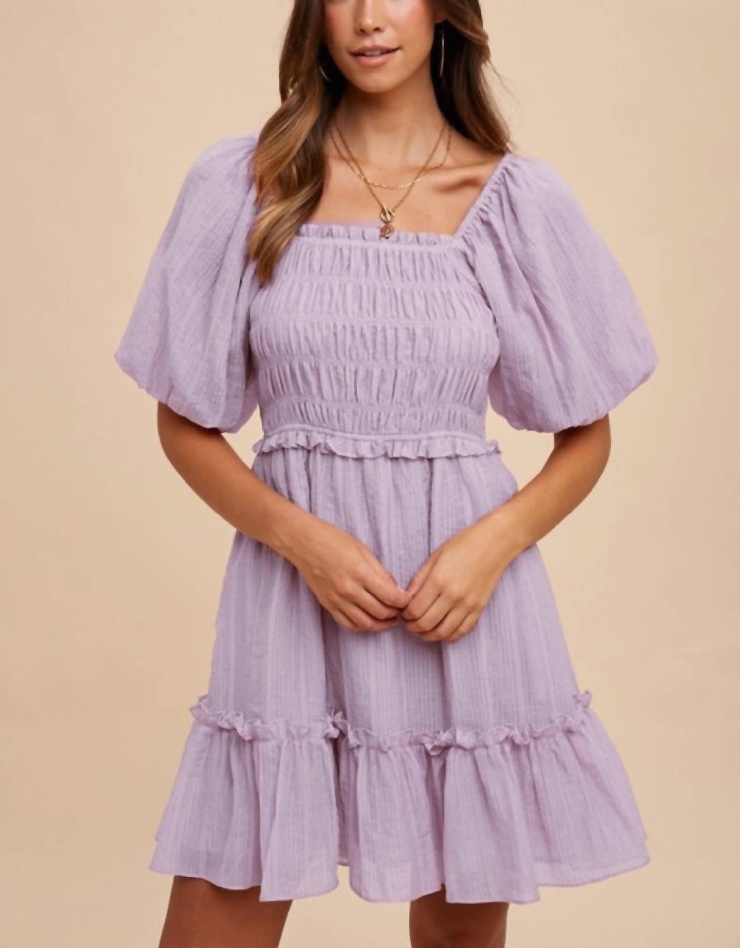 A short and breezy dress for those warmer days. Introducing the Smocking Bodice Elastic Tiered Mini Dress by AnnieWear, crafted in a delightful lilac shade for a touch of charm. This women's mini dress features short bubble sleeves and a square neckline, designed in crinkled Tencel woven fabric. Made from a blend of 58% Tencel and 42% nylon, it offers a smocked bodice and inner lining with mini ruffle detailing for added texture. Closure: Pull on.