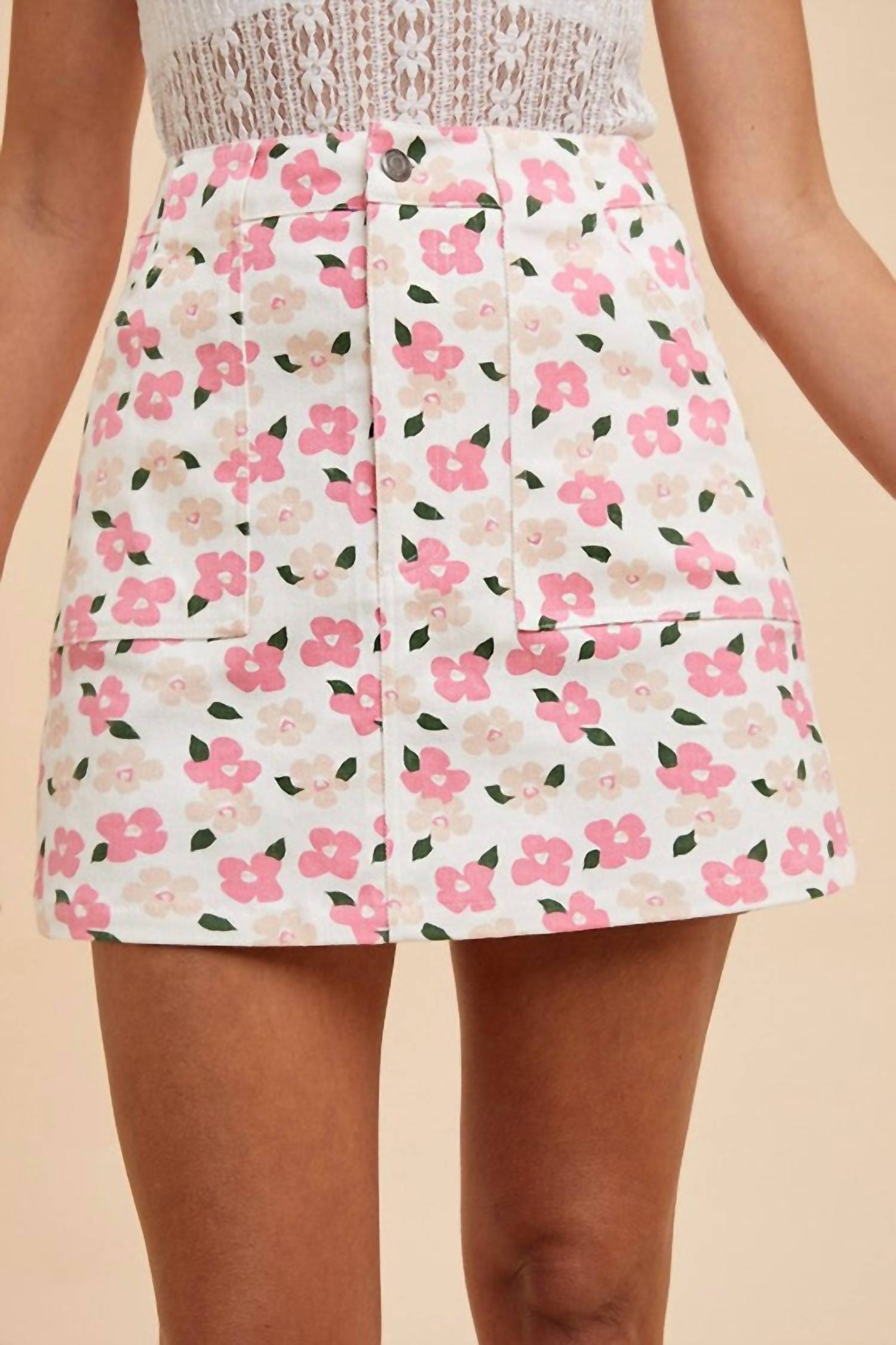 Show just the right amount of leg in this fit flattering mini. Introducing The Floral Denim Mini Skirt by AnnieWear, a vibrant addition to your spring wardrobe in a playful pink shade. This mini skirt is crafted from a cotton blend featuring a stretchy composition of 98% Cotton and 2% Spandex, ensuring both comfort and style. Designed with a floral pattern and convenient pocket details, its button closure adds a practical touch to this floral delight. Care instructions are straightforward: simply machine wash and embrace your inner flower child with this 90s fashion resurgence.