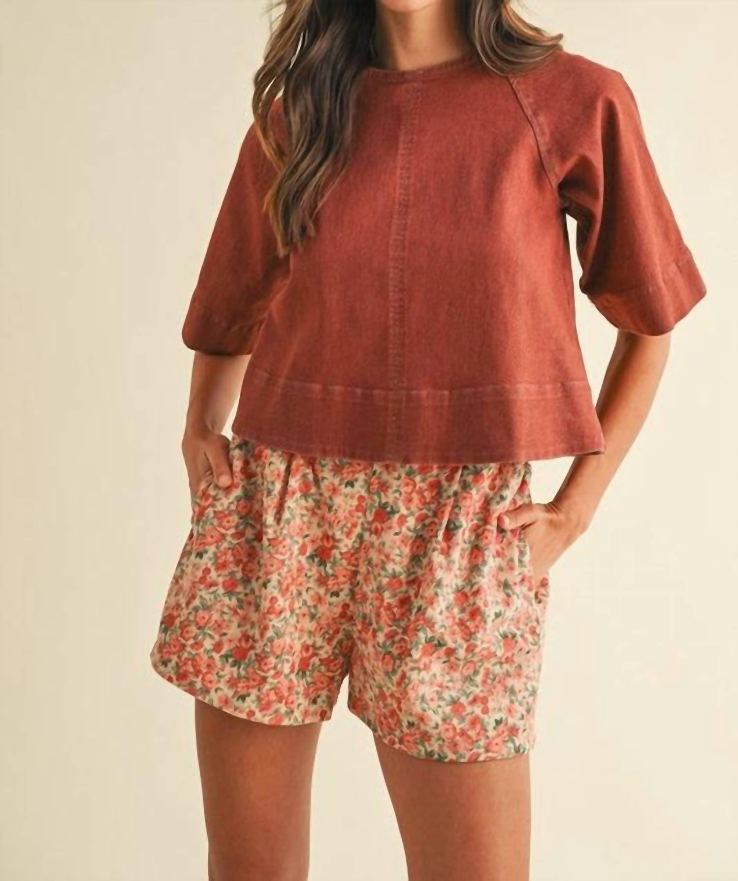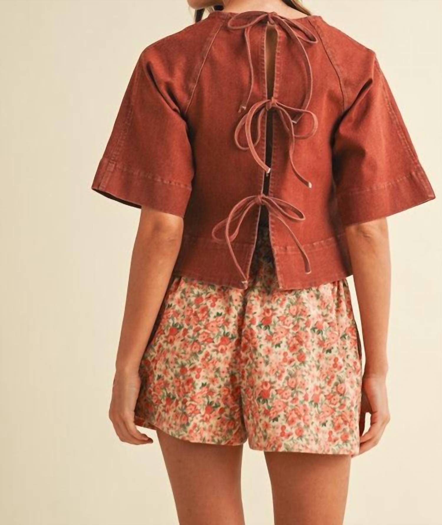A timeless blouse that will never go out of style. Introducing the Tie Back Denim Top by AnnieWear, a minimalist piece perfect for summer vacations. This women's short sleeve blouse comes in a solid brick color and features a stylish collar neckline and a unique tie closure at the back. Made from stretch denim, this top effortlessly blends comfort with chic style. Ideal for those who seek versatile wardrobe staples without the fuss of pockets.