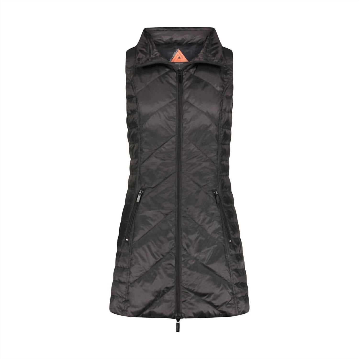 Throw this vest over an all black outfit for a perfectly polished look. This metallic chevron quilted vest offers a perfect blend of style and functionality. Designed with three convenient pockets, it provides practicality for outdoor activities while maintaining a sleek, fashionable look. Made from 100% water-resistant nylon, it’s durable and versatile enough to be worn on its own.