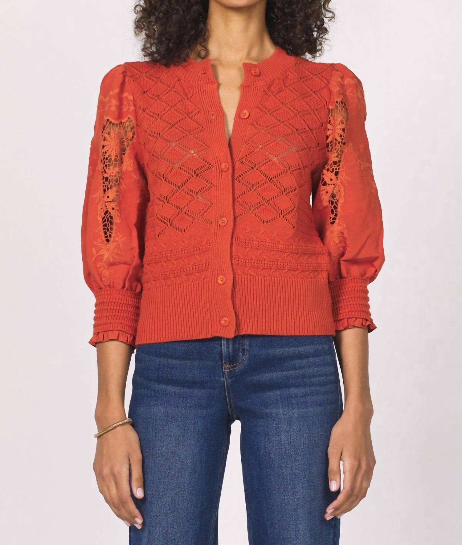 The Ankara Lace Knit Top by Another Love in Orange Maple is a perfect blend of vintage charm and modern flair. Featuring three-quarter romantic lace-paneled puff sleeves and a richly textured diamond knit bodice, this cardigan is a standout piece for any occasion. Constructed with a body composition of 100% cotton and sleeves made of 85% rayon and 15% polyester, the top measures 21" in body length, 20" in sleeve length, and 36" in bust for a size small. Closure: Button closure. For care, hand wash cold and reshape to dry flat.