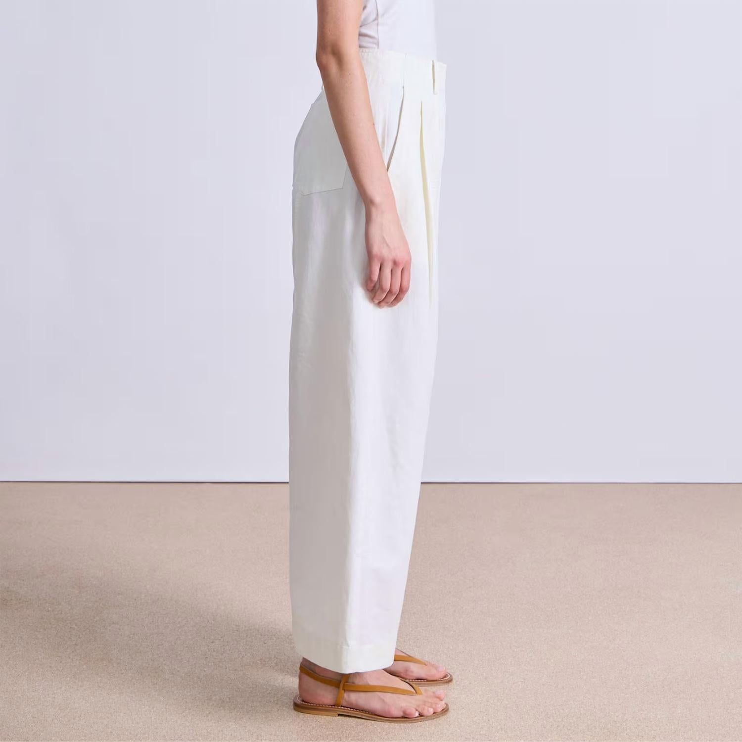 Elevate your wardrobe with the Cropped Cybil Trouser by APIECE APART, perfect for both casual and formal settings. Featuring a high waist and a cropped wide barrel leg, these cream trousers are designed with single front pleats and slant pockets for added functionality. Made from a 75% cotton and 25% linen blend, they come with a zip closure and a relaxed fit, ensuring comfort throughout the day. With a 27" inseam, these trousers require dry cleaning and are available in size 4, with a front rise of 12 3/4". Model is 5'10" and wearing a size 4, fitting true to size.