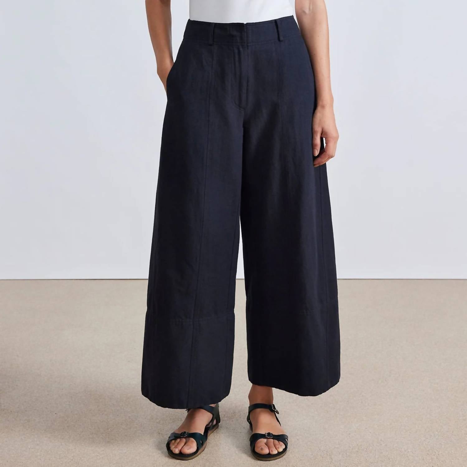 Introducing the Malou Wide Leg Pant by Apiece Apart, a perfect choice for minimalist style in a chic indigo hue. These pants feature a relaxed fit with a flattering wide leg design, ideal for travel or spring outings. Composition details are not provided. Closure: Snap closure. Care: Machine wash and tumble dry.