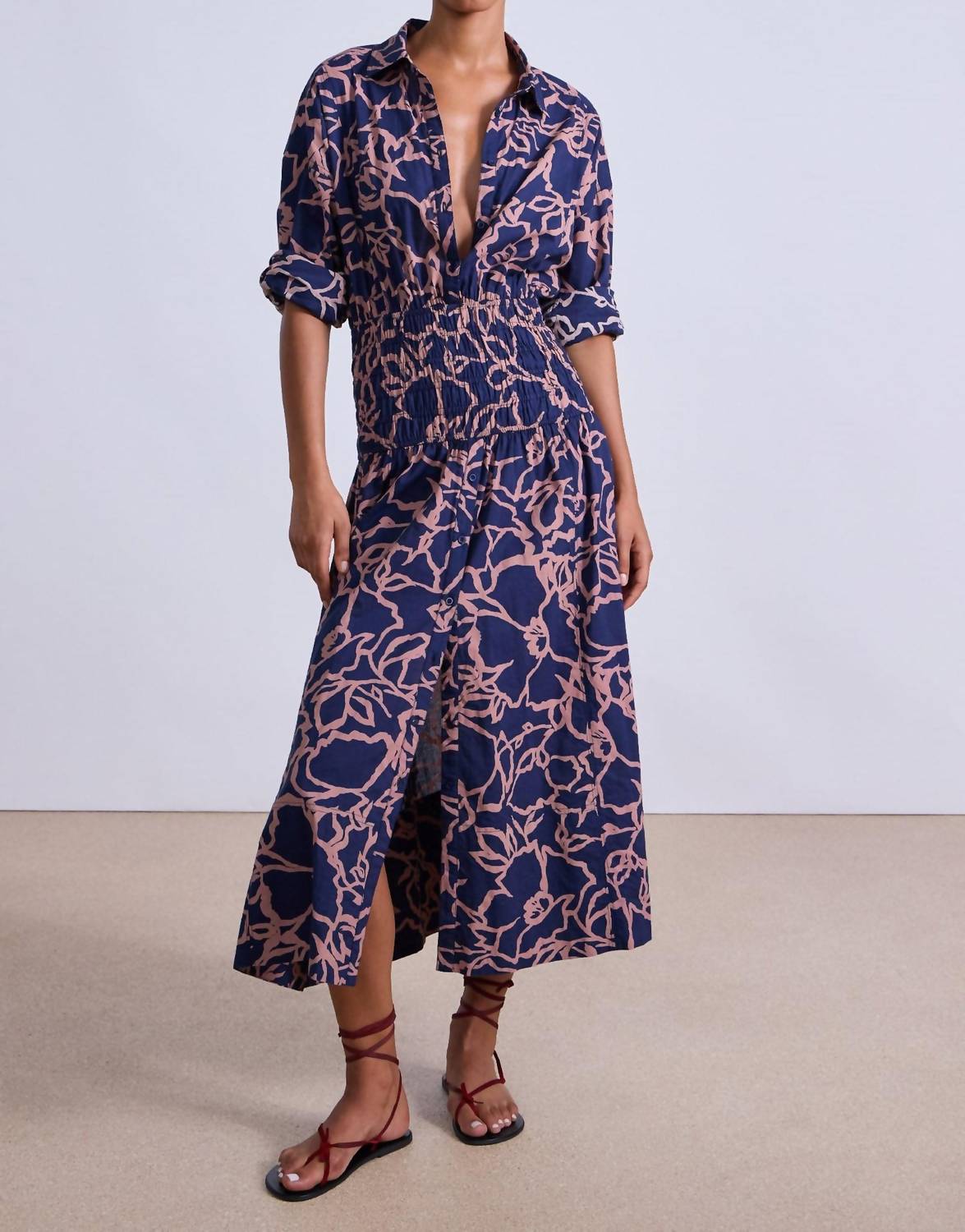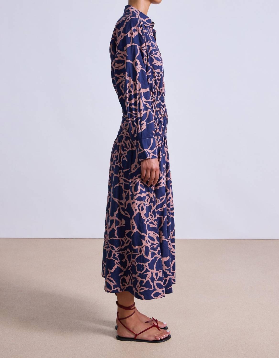 Introducing the Sophia Smocked Shirt Dress by APIECE APART, a stunning choice for your vacation wardrobe in Large Lace Floral Navy. This midi dress features long sleeves, crafted from 100% organic cotton and made in India. Designed with a dropped shoulder, shirt collar, and front button closure, it offers a flattering soft a-line silhouette with an elastic skirt detail. Care instructions recommend dry cleaning to maintain its elegant look. Measurements from size S: Length 52" from shoulder, fitting true to size.