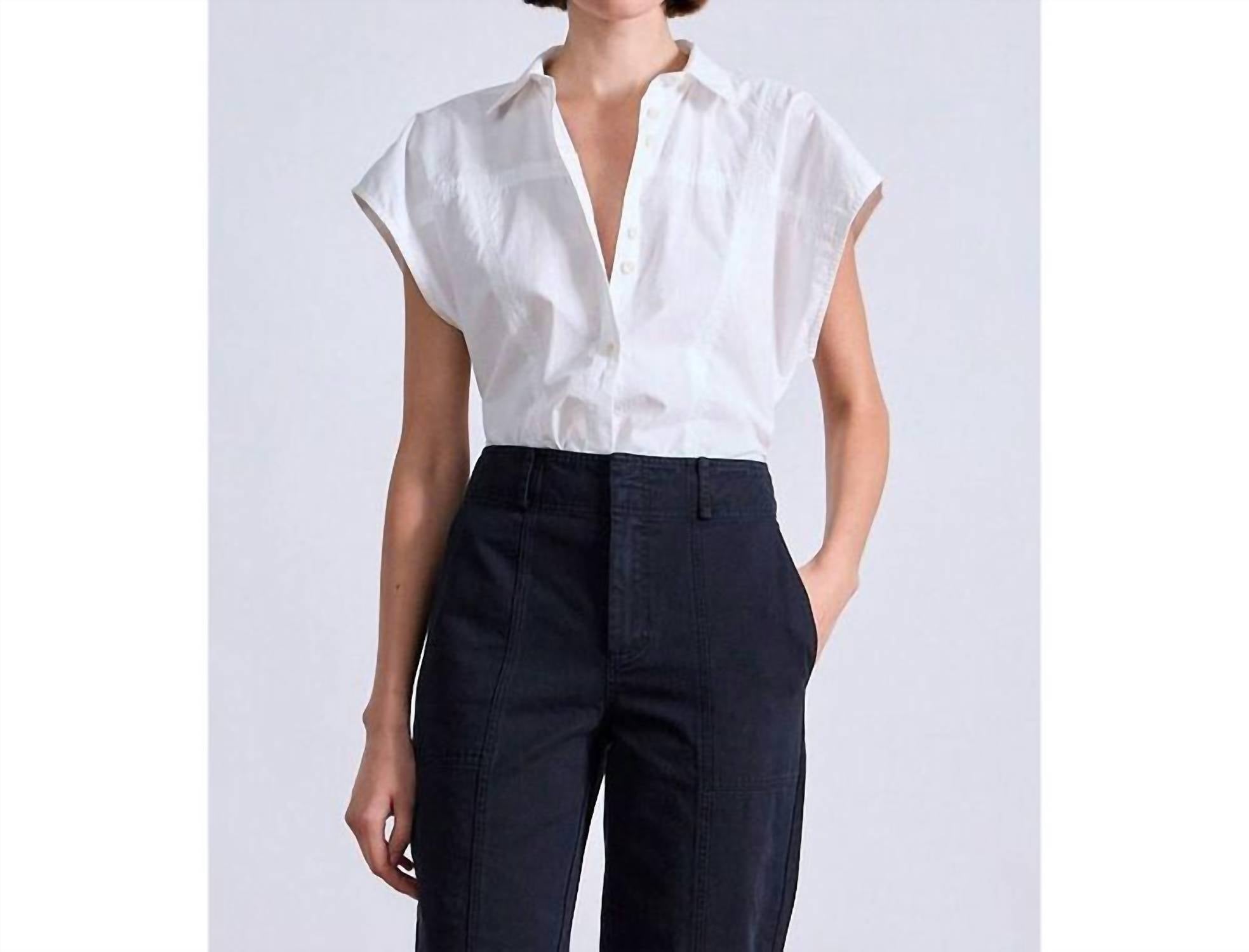 A versatile blouse that works from desk to dinner! Introducing the Toni Sleeveless Top by Apiece Apart, a chic choice for any minimalist wardrobe. This solid cream blouse features cap sleeves and is crafted from 100% organic cotton. Made in India, it boasts a stylish collar and secure button closure for a refined finish. Care for this piece by machine washing it and laying it flat to dry.