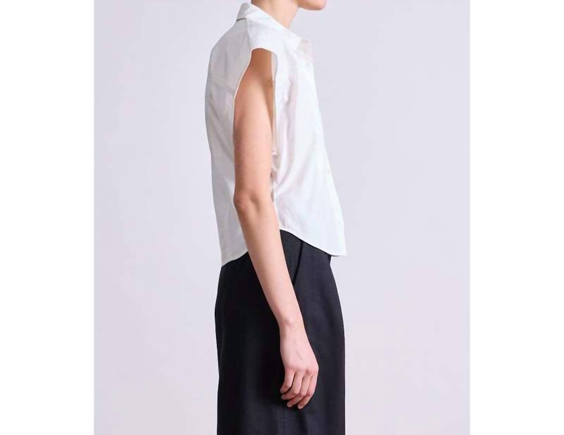 Introducing the Toni Sleeveless Top by Apiece Apart, a chic choice for any minimalist wardrobe. This solid cream blouse features cap sleeves and is crafted from 100% organic cotton. Made in India, it boasts a stylish collar and secure button closure for a refined finish. Care for this piece by machine washing it and laying it flat to dry.