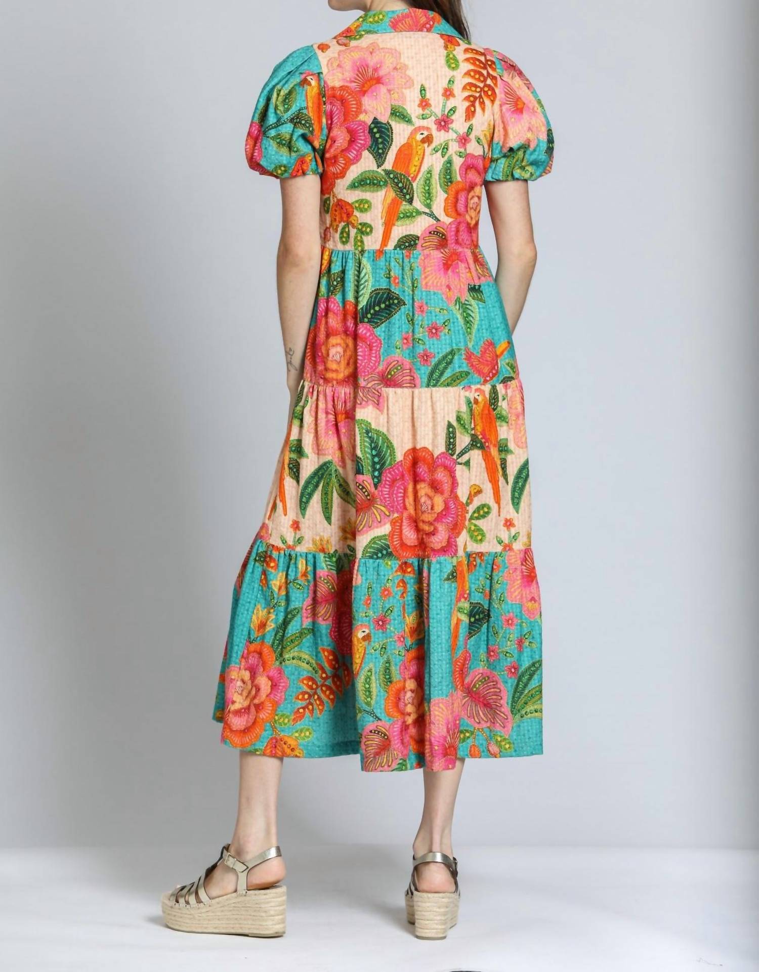 A midi dress so versatile, your options for wearing it are endless. Elegant boho chic option for your wardrobe. Features puff short sleeves and is crafted from 100% cotton, providing a breathable and lightweight feel. With a flowing silhouette that falls mid-calf and a button-front closure, perfect for sunny days and holiday parties alike. Care for this vibrant turquoise multi floral design with a machine wash on a gentle cycle and line dry. Model is 5'9" and wearing a size Small.
