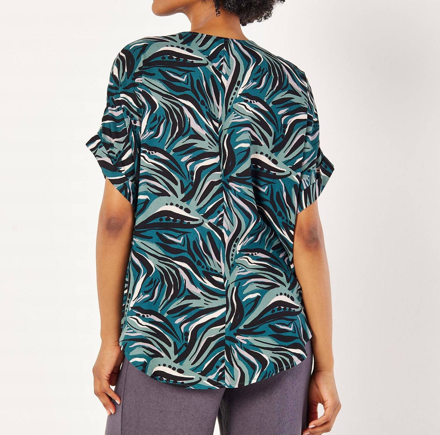 This T-shirt style blouse features short sleeves with turn-up cuffs, a V-neckline, and a relaxed fit, crafted from 100% Lenzing Ecovero Viscose for comfort and sustainability. Designed with pleat detailing and a dipped, curved hem, it offers a modern take on a classic silhouette. This top is made in Vietnam and is conveniently a pull-on style, with machine wash care instructions. Model is wearing size XS/UK 8 and stands 5' 10" tall.
