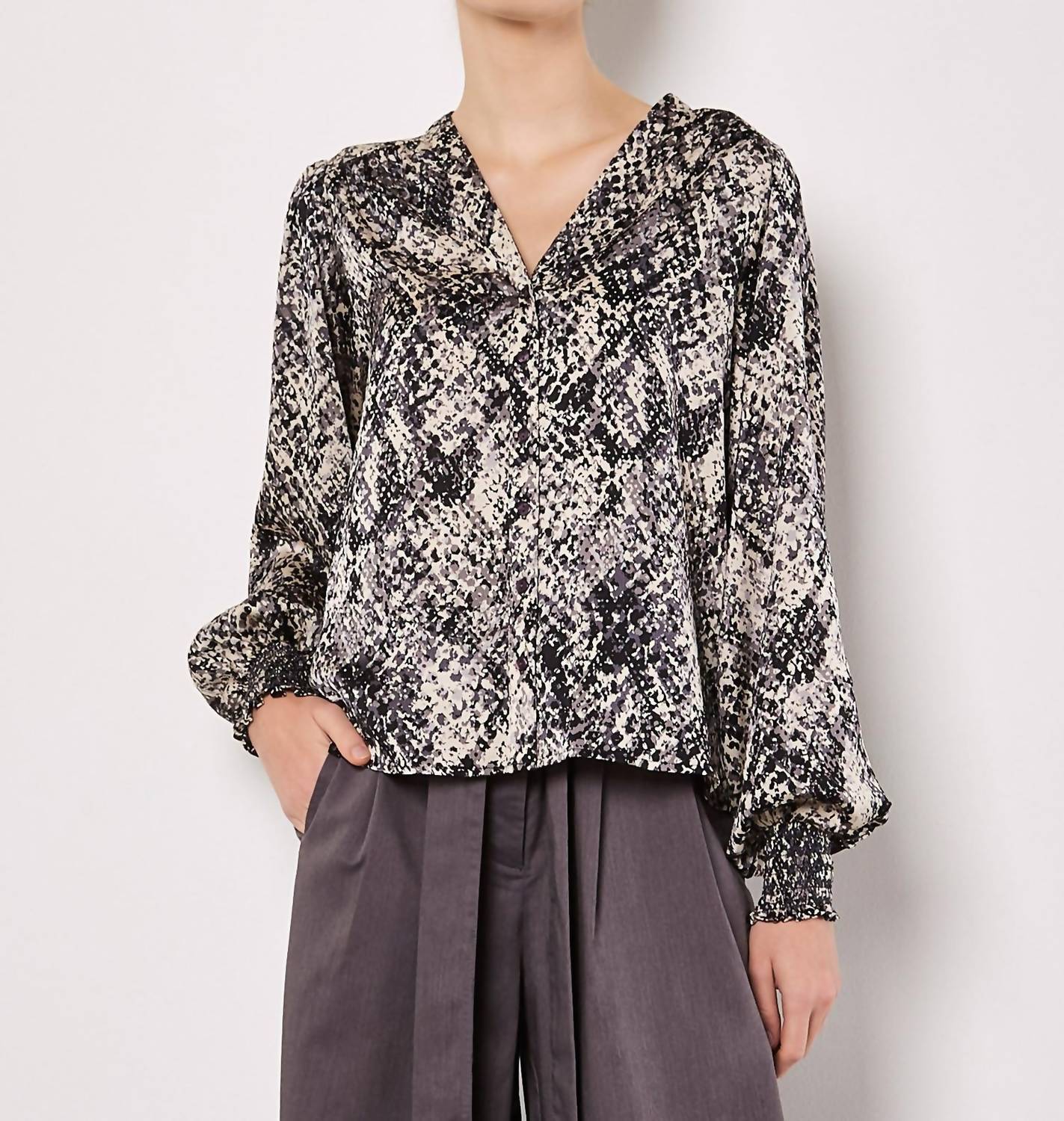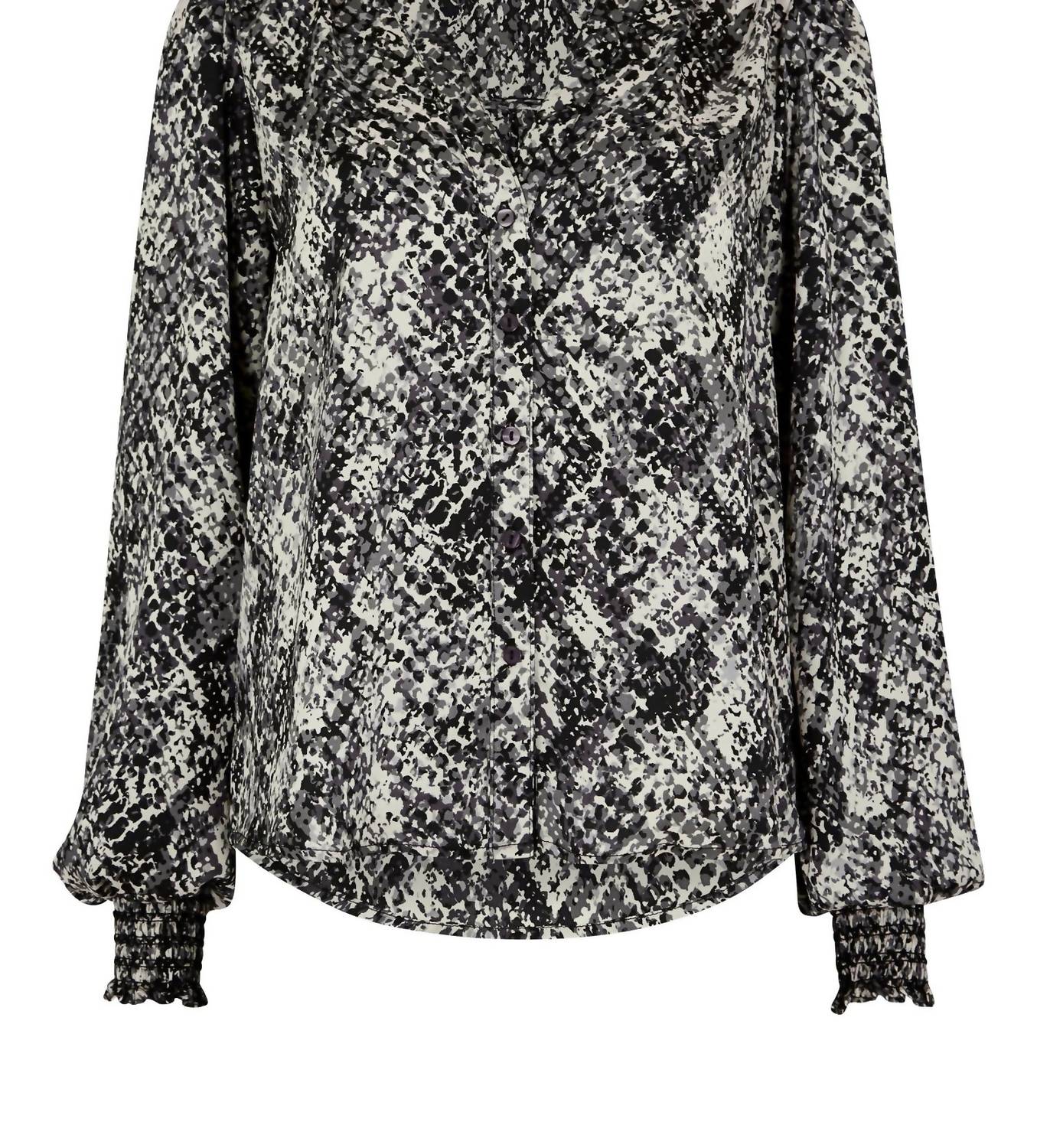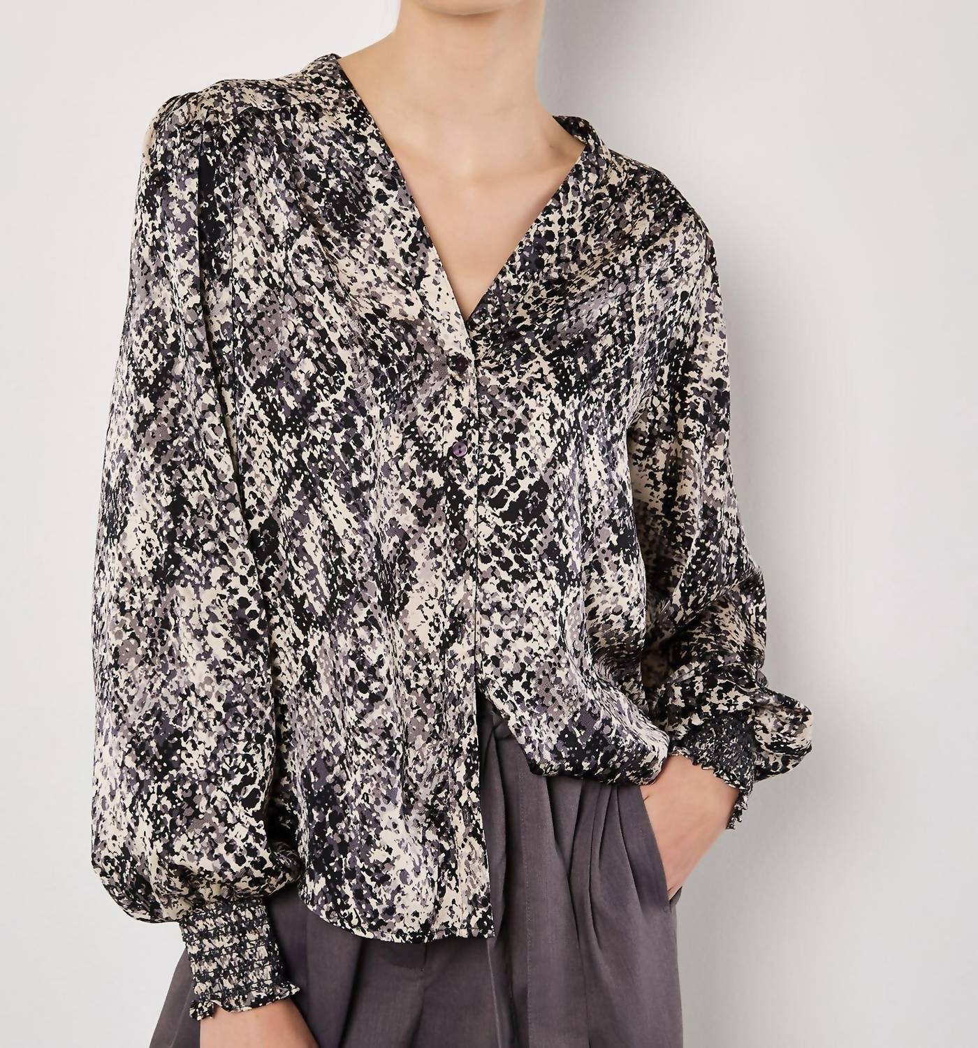 Pair this with your favorite jeans and slides for your next girls night out. This chic shirt features a bold snakeskin print and balloon sleeves. Made from hammered satin, it has a V-neckline, button-down front, smocked cuffs, and a curved hem. Made from 100% polyester. Length: 23.23". Machine wash on synthetic cycle.