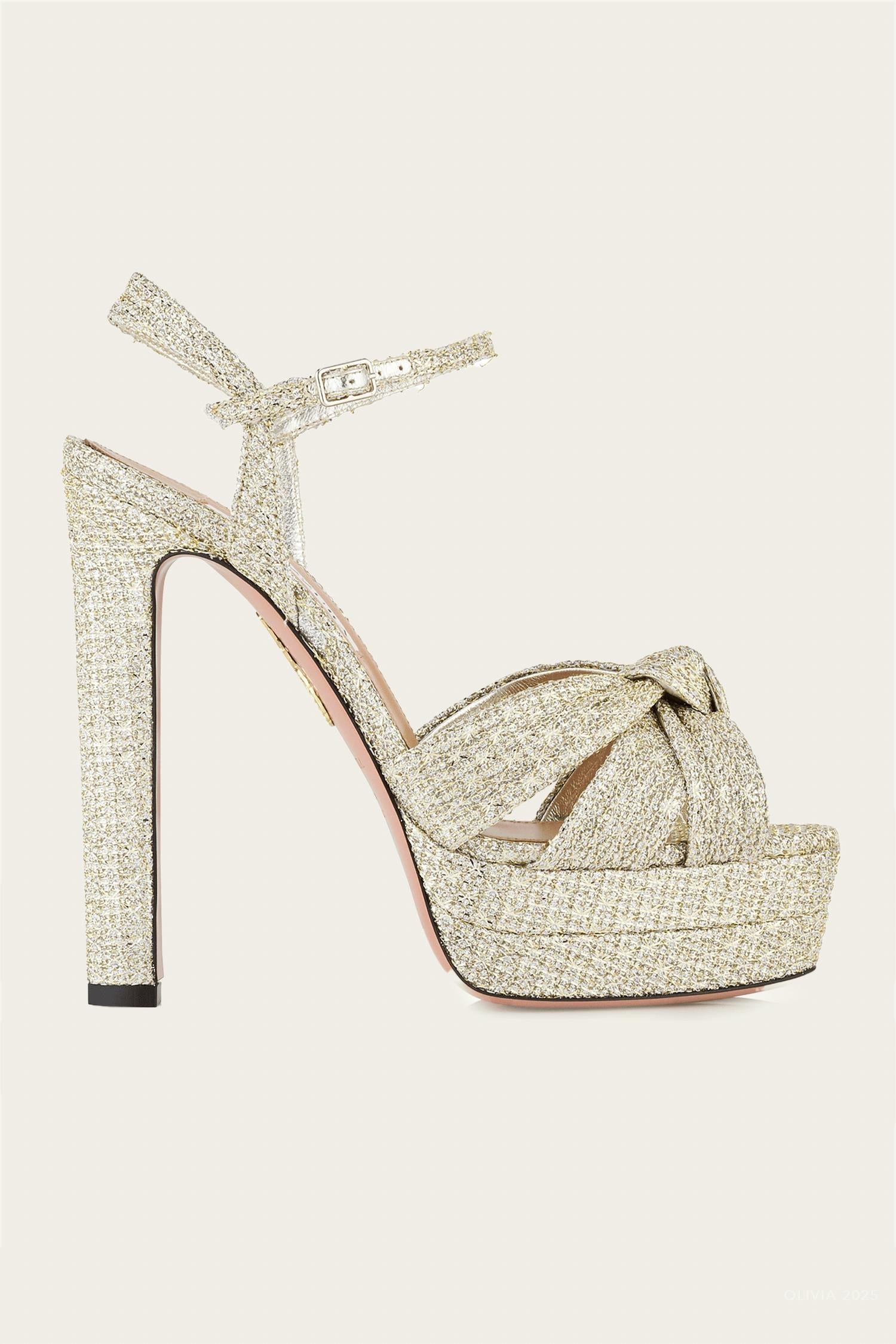Step into elegance with the Women's Nina Plateau Sandal by Aquazzura, perfect for evening events. Expertly crafted in Italy, this stunning heel boasts a silver tweed upper accented with gold-tone hardware and a knotted strap detail. Enjoy the sophistication of its leather lining and sole, alongside an open almond toe, ankle strap with buckle closure, and a striking stiletto heel that measures approximately 130mm (5.1 inches) with a 36mm (1.4 inch) platform. The sandal's upper composition features 98% textile with crossbred leather, complete with a luxurious 100% goat leather lining and 100% calf leather sole.