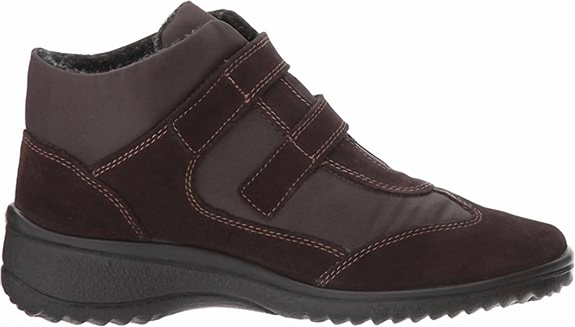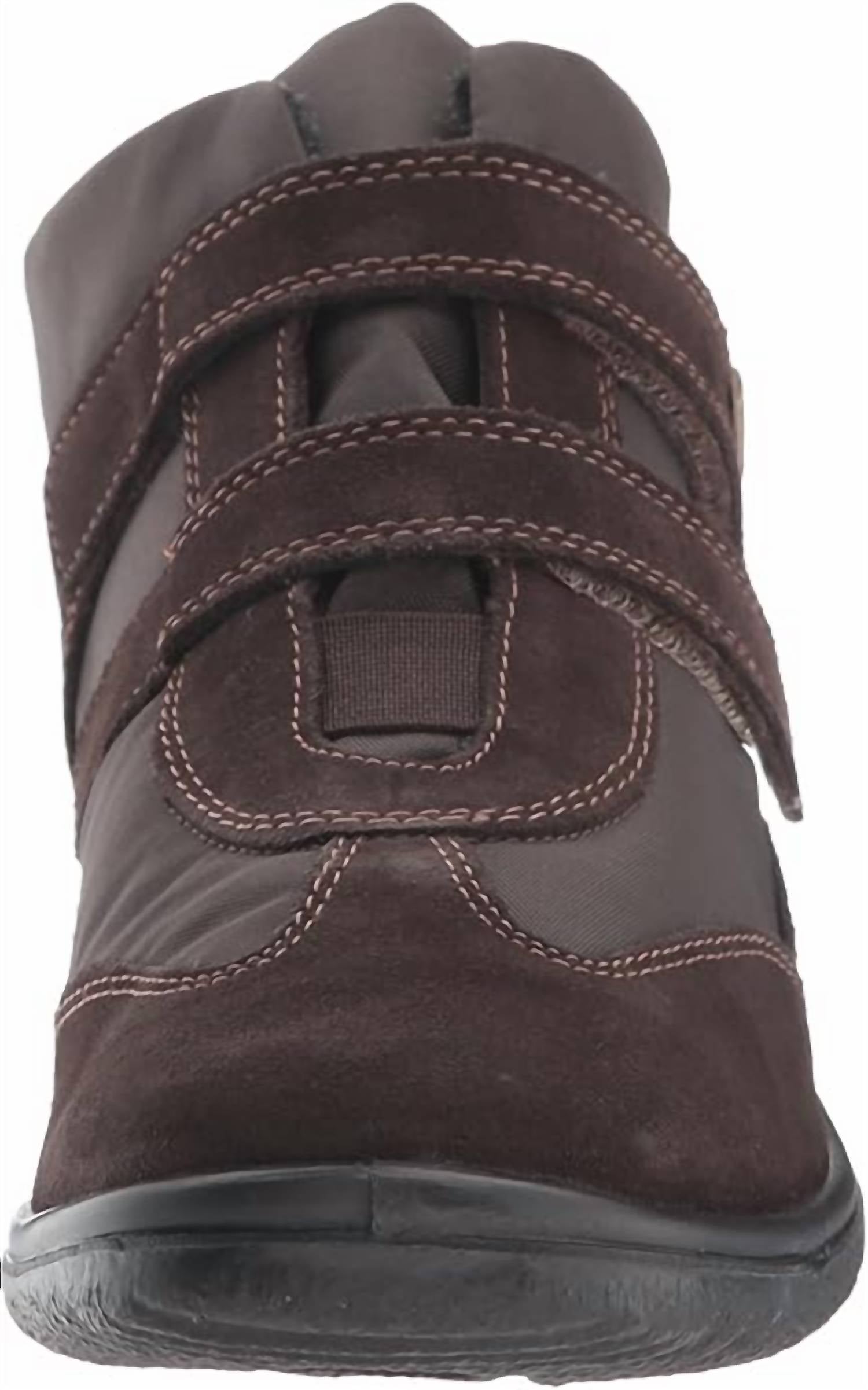 This ankle boot prioritizes comfort and waterproof performance with Gore-Tex technology. Made from sturdy suede and fabric, it’s built to resist the elements. A cushioned footbed and flexible, durable sole provide excellent support, while double Velcro straps allow for quick and easy wear.