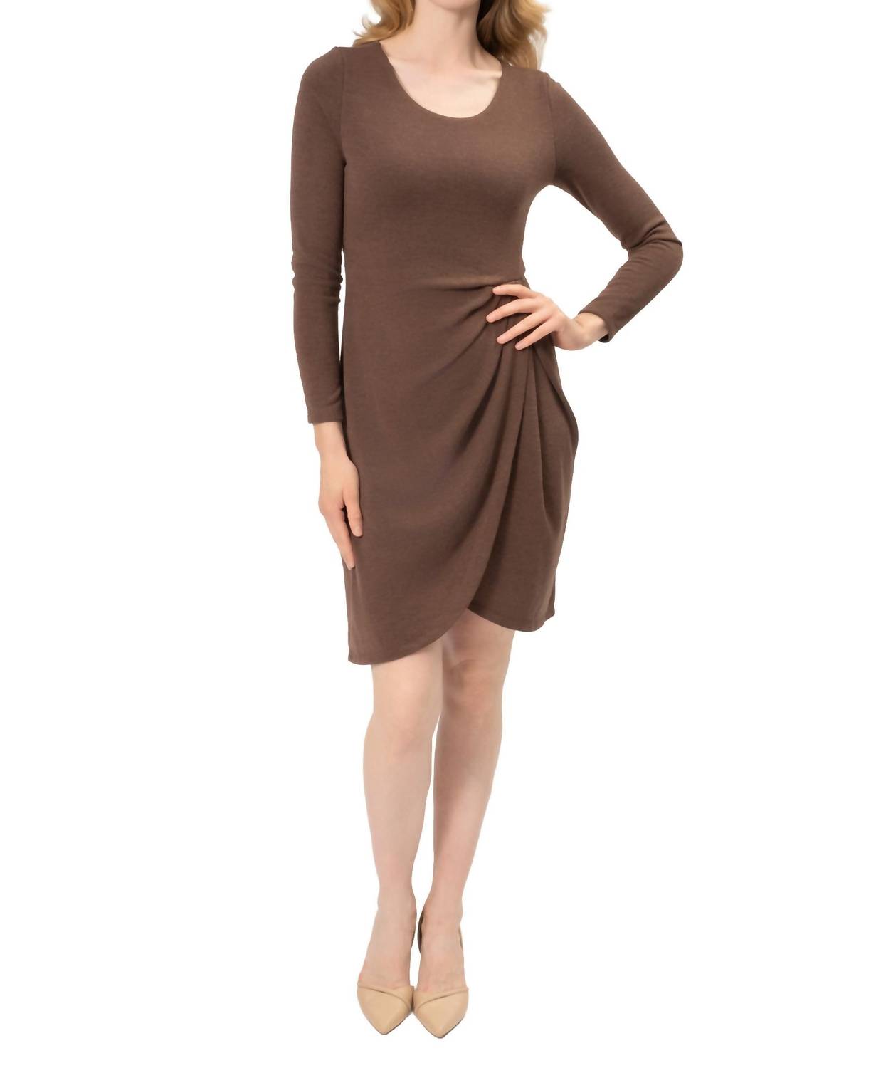 A short and breezy dress for those warmer days. Presenting the Wrenley Mini Dress by Area Stars, a stunning addition to your spring wardrobe. This bodycon dress in a solid brown hue boasts long sleeves and a fashionable scoopneck, perfect for any vacation or Easter occasion. Designed as a pull-on style, it effortlessly combines comfort and chic style. Care is easy with dry clean instructions, ensuring your dress remains in pristine condition.
