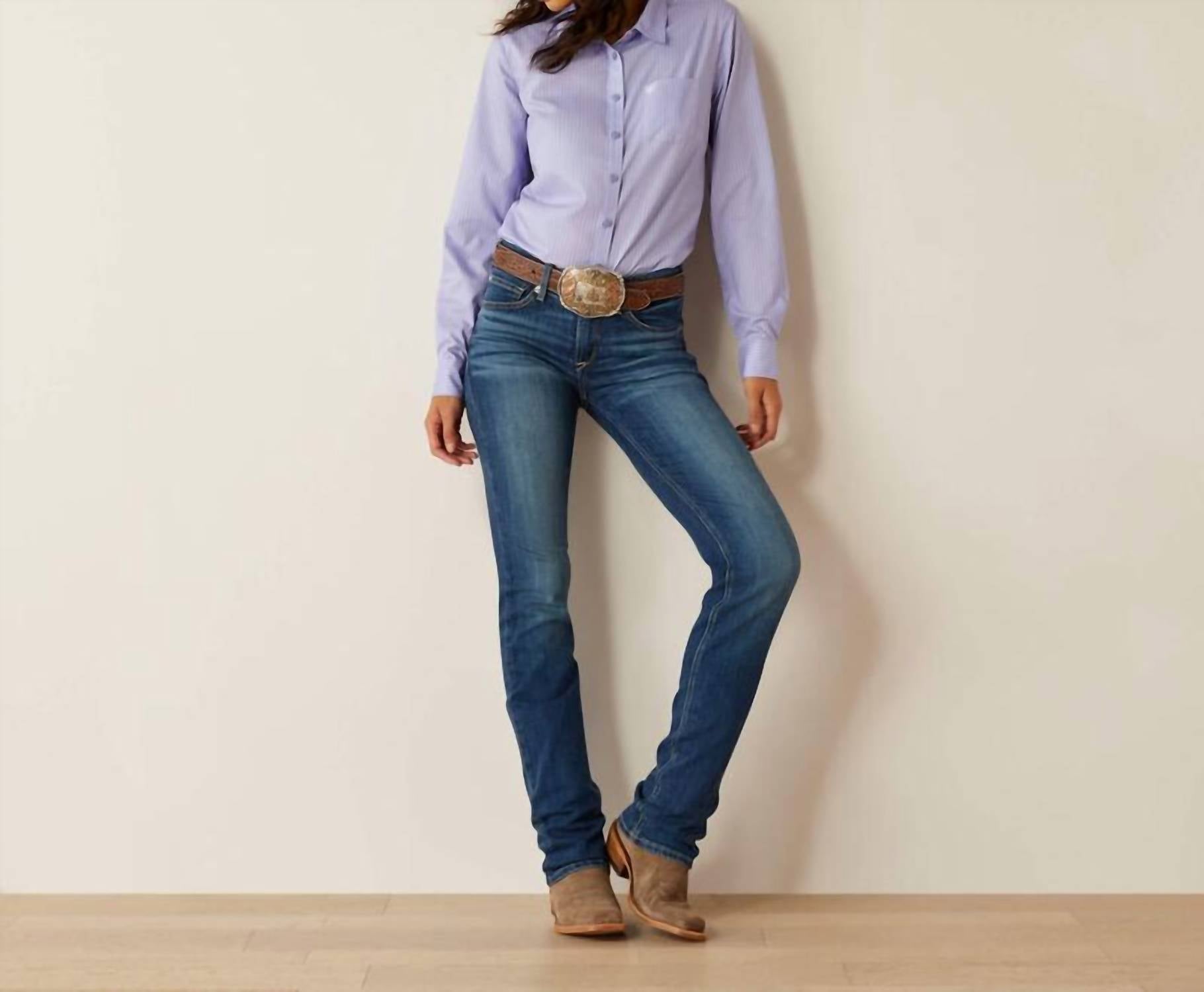 Elevate your wardrobe with the Kirby Pro Shirt by ARIAT, featuring long sleeves and crafted in 100% polyester for optimal stretch and mobility. This sweet lavender striped button down shirt is perfect for a flattering, polished look, whether you're in the arena or at a dinner party. Enhanced with UPF 40 for added sun protection, it also includes a chest pocket for convenience. Closure: Button closure. Ideal for spring events like Thanksgiving, this piece is engineered with moisture-wicking technology for all-day comfort.