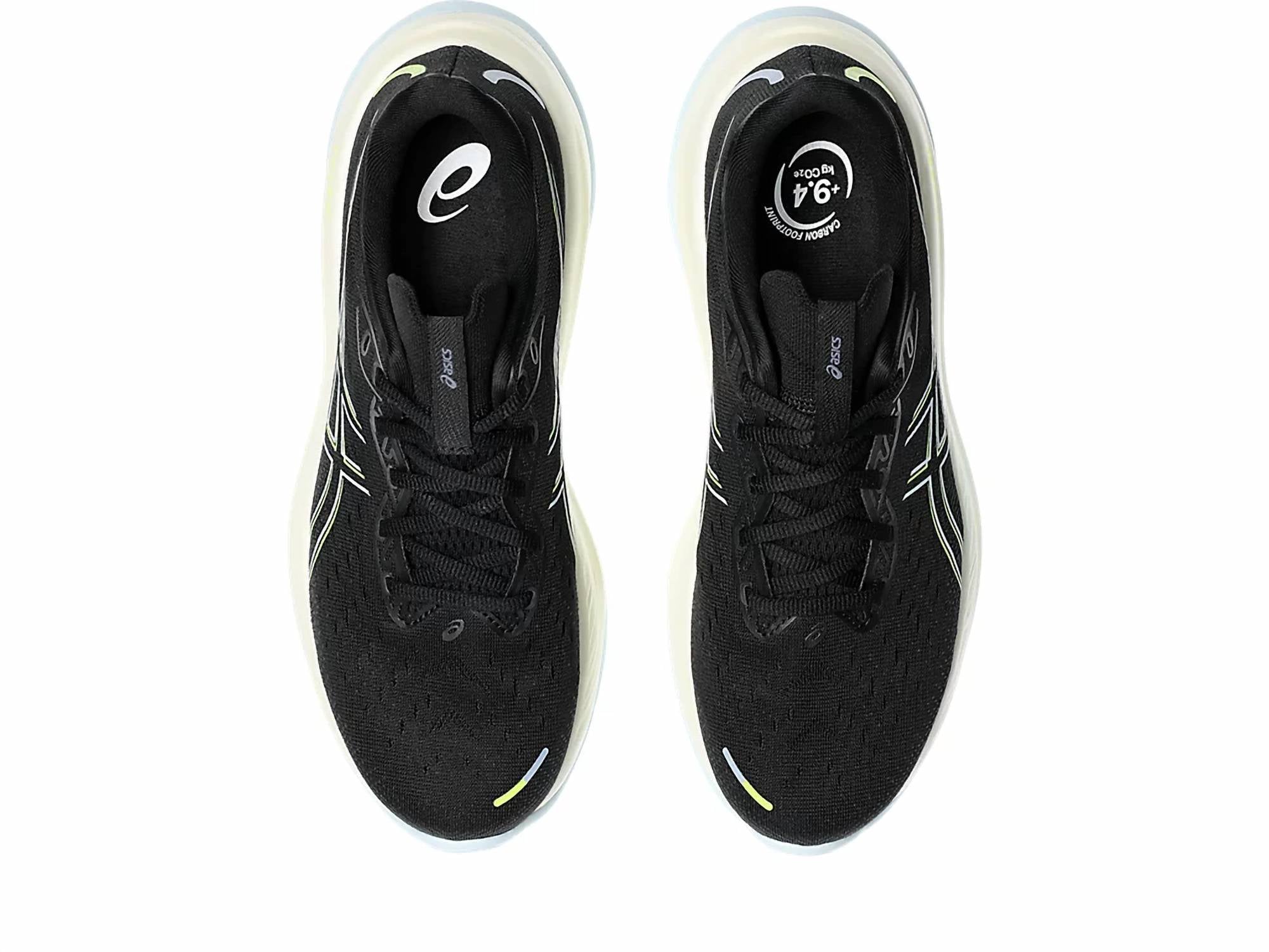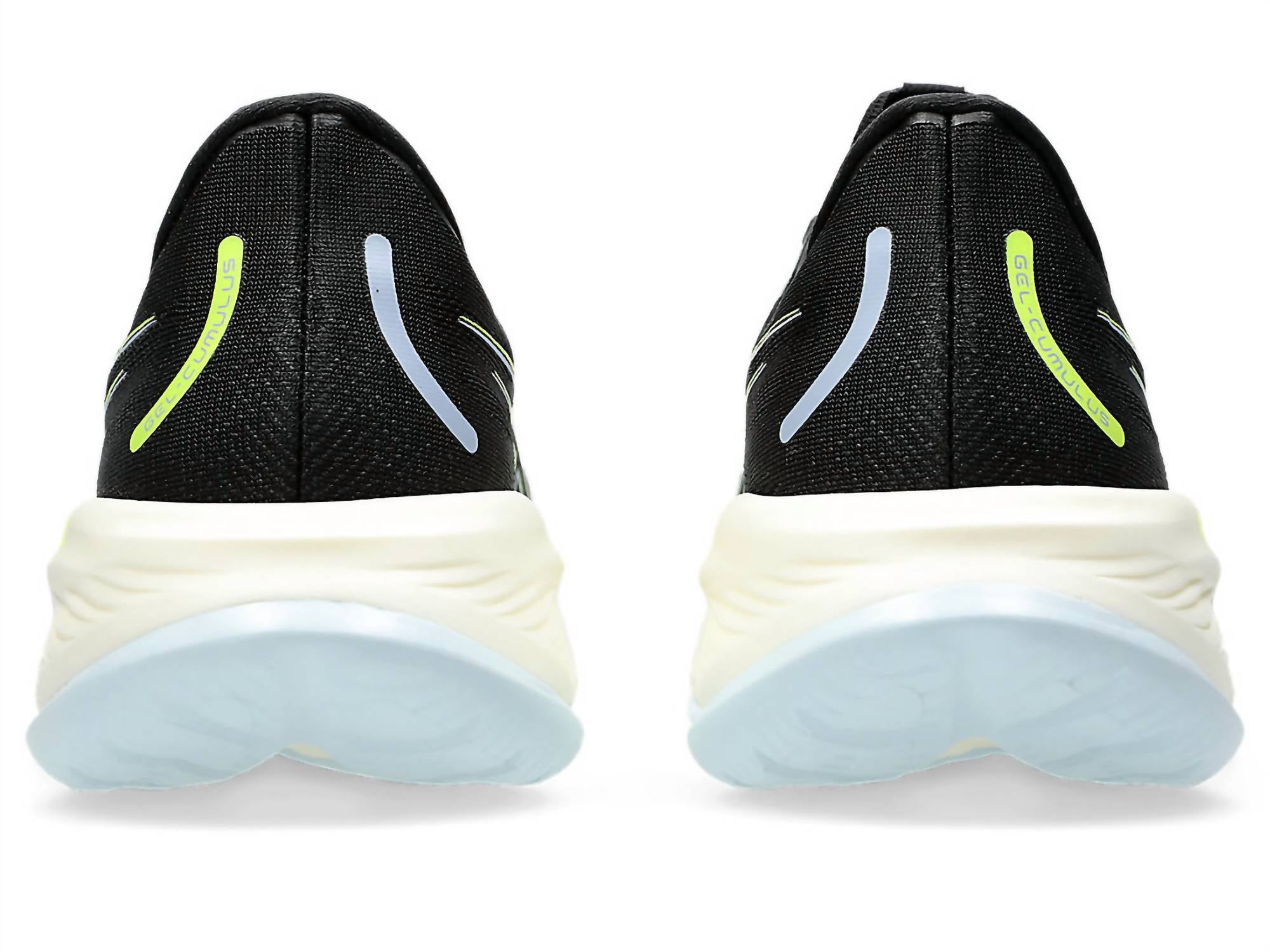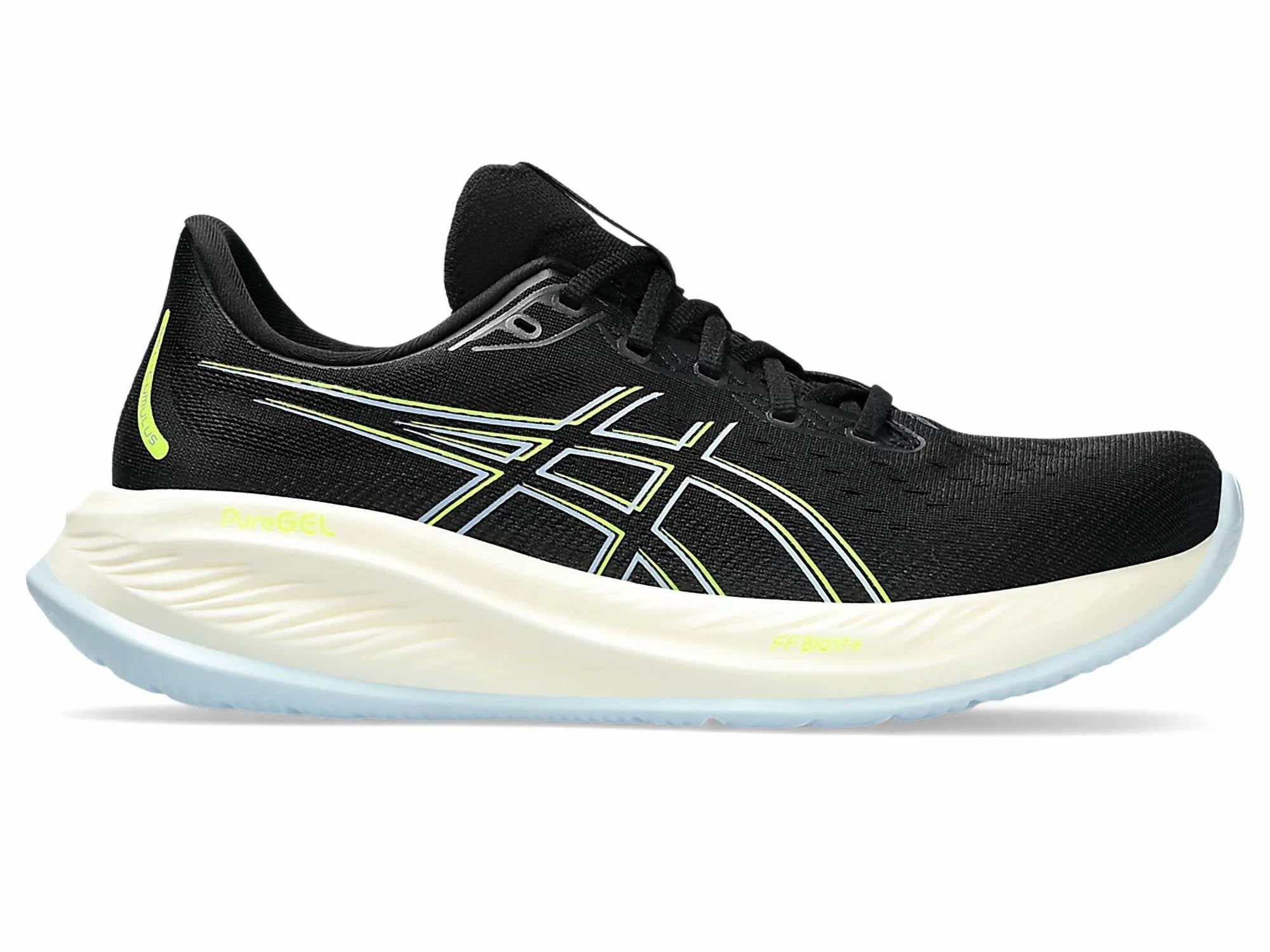 Experience unparalleled comfort with the Men's Gel-Cumulus 26 Running Shoes by ASICS in striking Black/Safety Yellow. Designed for road surfaces, these athletic shoes feature a responsive 8 mm heel drop and weigh just 255 g/9 oz. The innovative FF BLAST™ PLUS technology offers lightweight impact absorption and a responsive rebound, while PureGEL® technology ensures softer landings. An engineered mesh upper enhances breathability and comfort, with a sustainable sockliner produced using a dyeing process that significantly reduces water usage and carbon emissions. Made with at least 75% recycled content, these shoes combine performance with eco-conscious design.