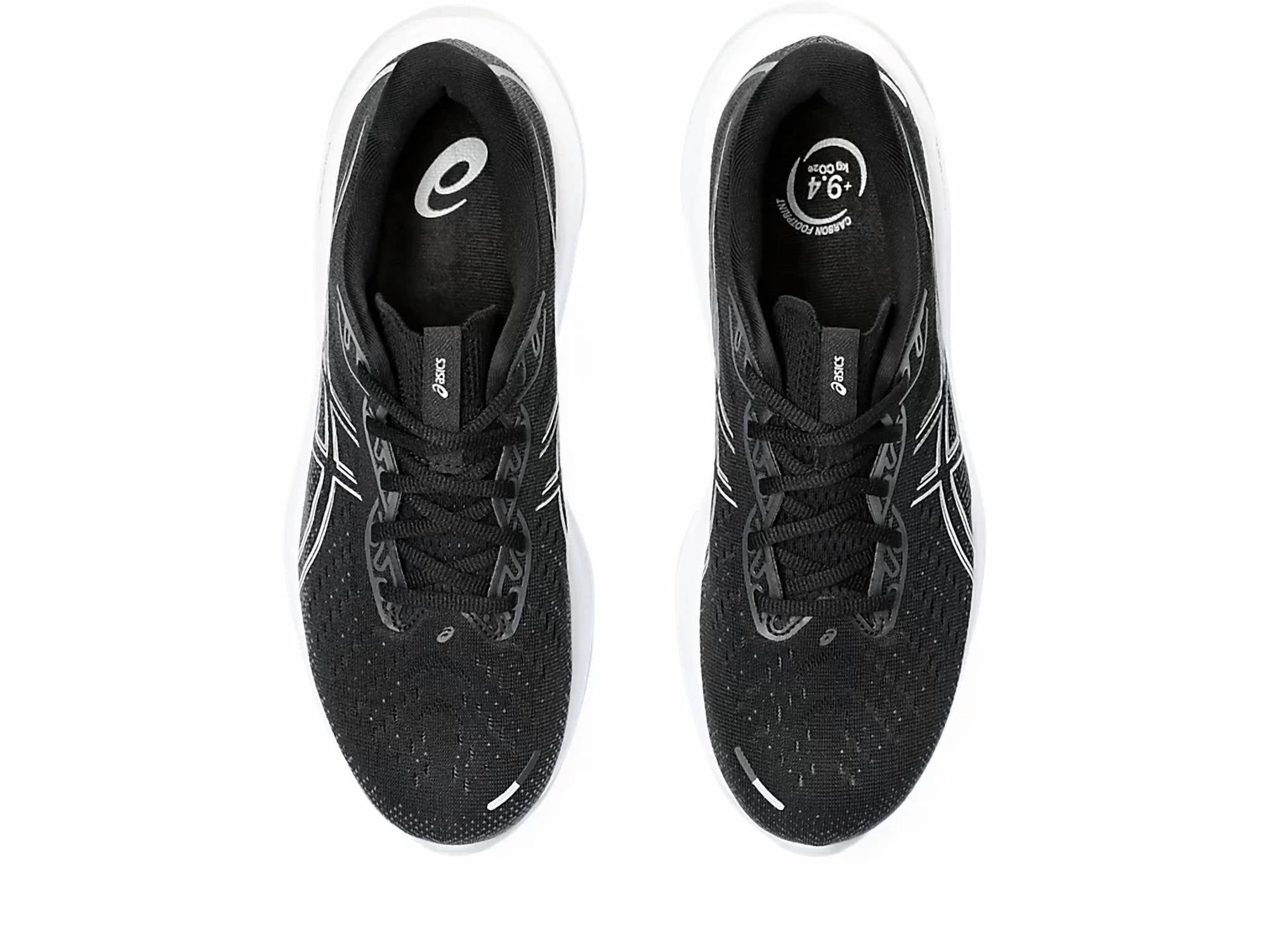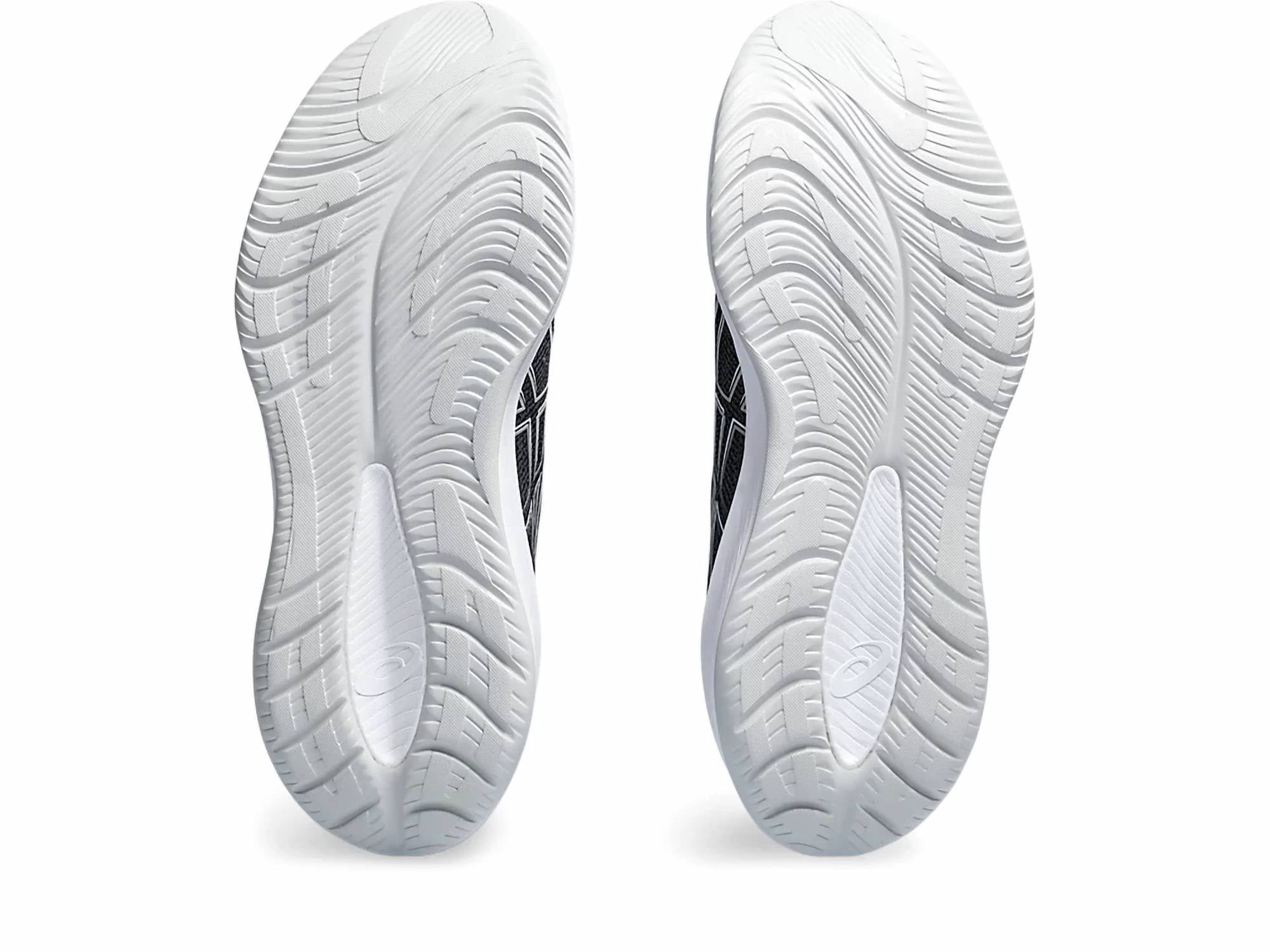 Unveiling the Men's Gel-Cumulus 26 Running Shoes by ASICS, designed for the road with advanced comfort and sustainability in mind. Flaunting a sleek Black/Concrete color, these athletic shoes feature an 8 mm heel drop and weigh just 255 g (9 oz), showcasing the innovative FF BLAST™ PLUS technology for lightweight cushioning and a responsive rebound. The engineered mesh upper enhances breathability, complemented by PureGEL® technology for softer landings. These shoes also incorporate at least 75% recycled material for reduced waste and carbon emissions, promising eco-conscious performance tailored for men with wide feet.