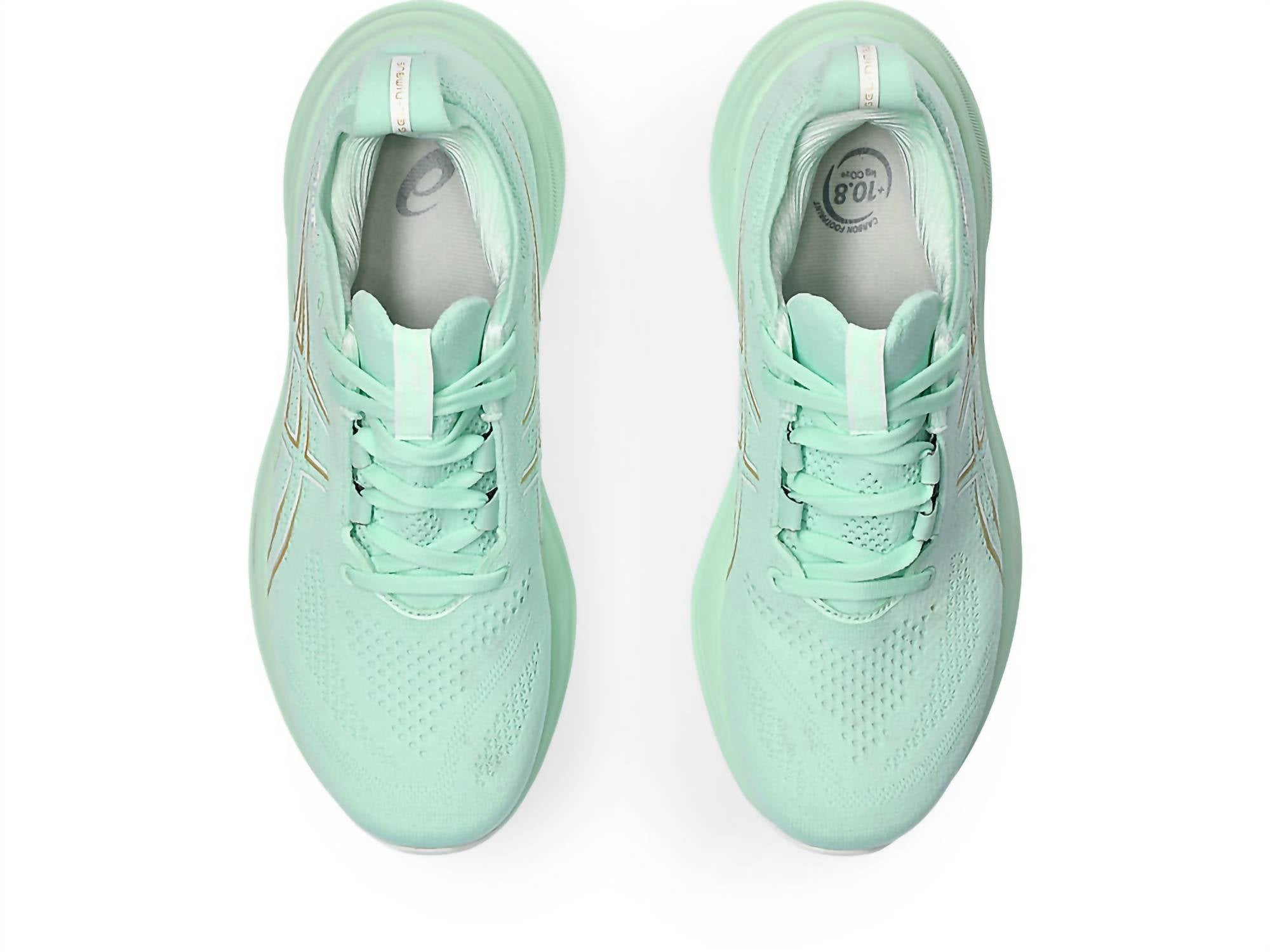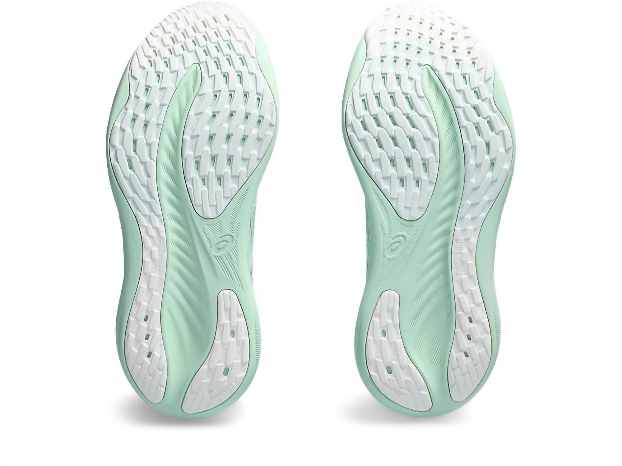 When fashion meets function. The GEL-NIMBUS 26 shoe features a soft engineered knit upper with ventilation, a hybrid outsole with ASICSGRIP rubber and AHARPLUS materials for grip, and an OrthoLite X-55 sockliner for comfort. The shoe is designed for runners with 75% of its upper material being recycled content, reducing waste and emissions. It also includes PureGEL technology for cushioning and FF BLAST PLUS ECO for a softer landing.