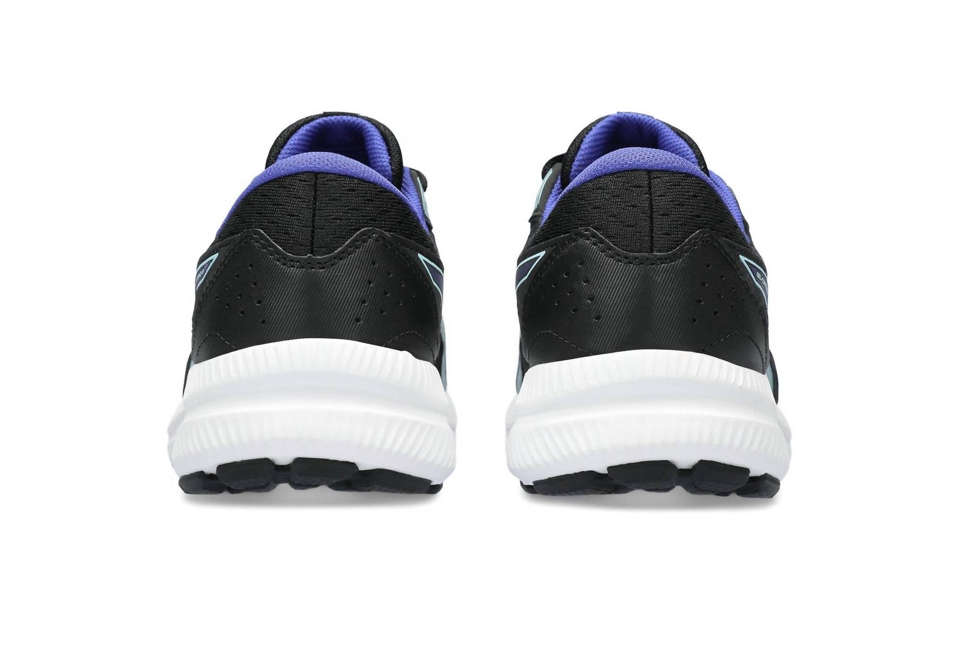 Step into performance and comfort with the ASICS Women's Gel Contend 9 Sneakers. Perfect for fitness and workout occasions, these sneakers feature a jacquard mesh upper that stretches with your foot's natural motion, while synthetic stitching overlays offer enhanced support. Enjoy its GEL™ technology and AMPLIFOAM™ cushioning in the midsole, providing a softer and more durable underfoot feel. Designed with a flat heel under 1 inch, these black, white, and blue sneakers are the ideal athleisure footwear for summer workouts, ensuring both style and functionality.