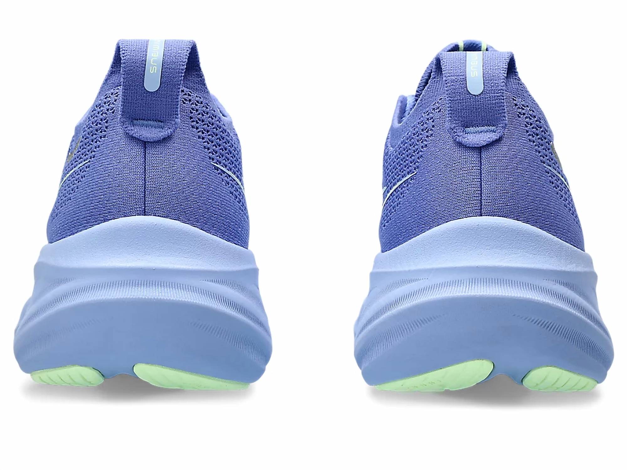 Workout in style with these adorable athletic sneakers. Experience superior comfort and performance with the Women's Gel-Nimbus 26 Running Shoes by ASICS, crafted in a vibrant Sapphire/Light Blue. This innovative design features an engineered knit upper made with at least 75% recycled content, ensuring both a soft feel around the foot and a reduced environmental footprint. Enhanced with PureGEL™ and FF BLAST™ PLUS ECO technologies, these shoes provide lightweight cushioning for softer landings and a responsive toe-off. The HYBRID ASICSGRIP™ outsole offers excellent grip and durability, complemented by reflective details for improved visibility in low-light conditions.