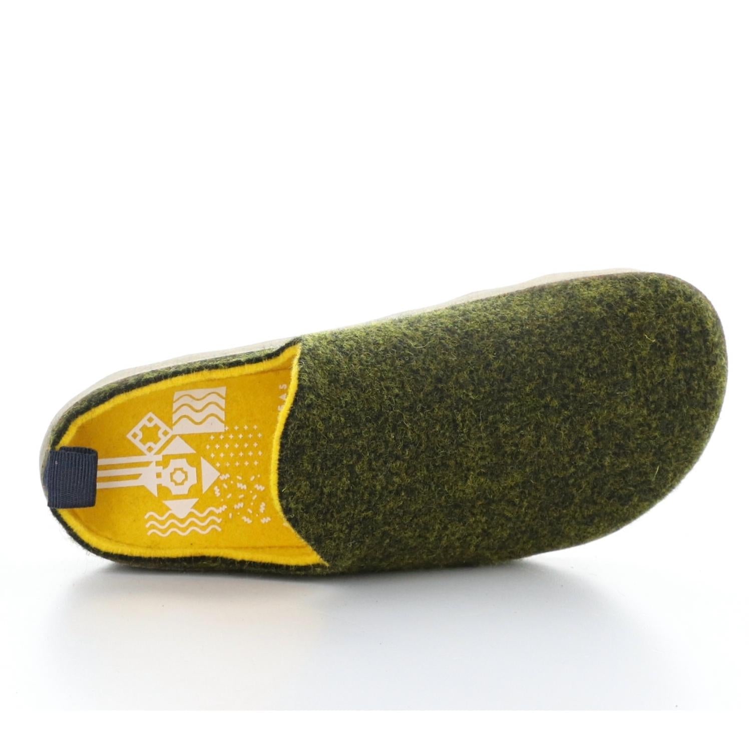Slip them on and go! Presenting the Women's Come Mule by ASPORTUGUESAS, where contemporary chic meets everyday comfort. Crafted with a soft wool upper, these slip-on mules feature a shock-absorbing 1.5" cork platform heel, perfect for versatile, seasonal wear. The contrasting yellow interior brings a playful touch to the forest green exterior, offering a unique look for fall. Made in Portugal, these mules are a stylish eco-friendly choice.