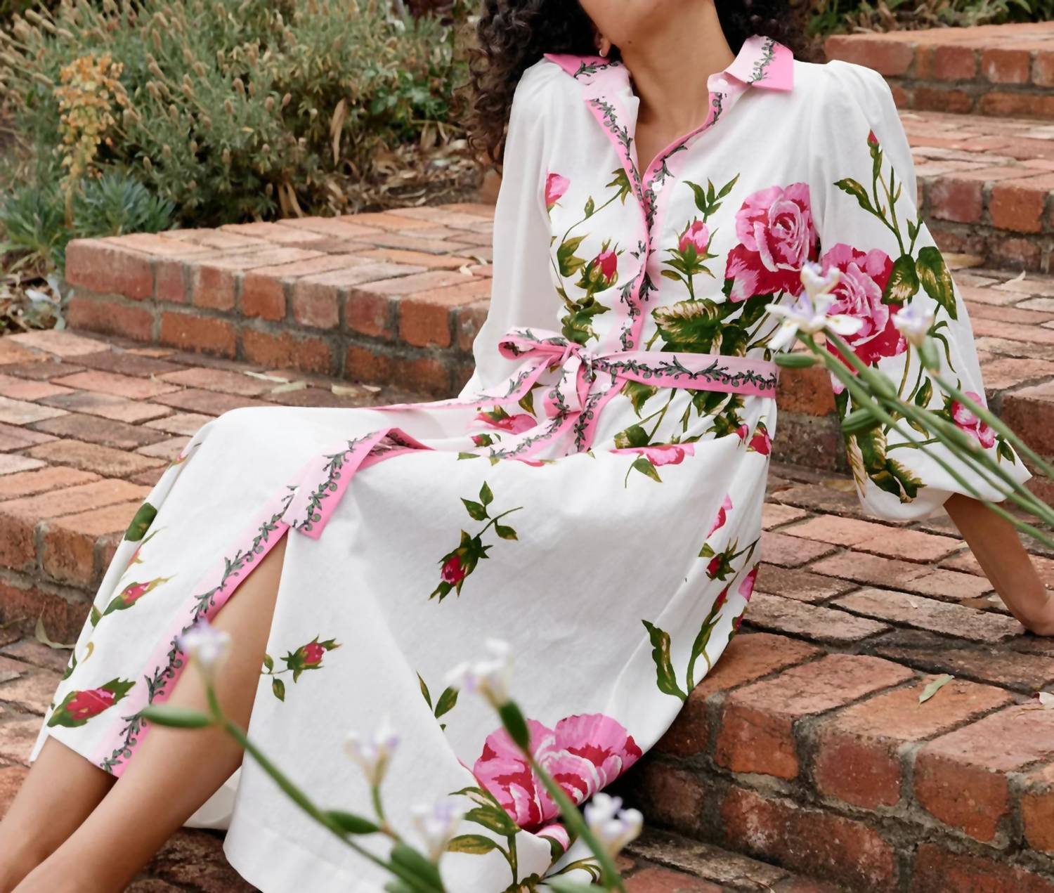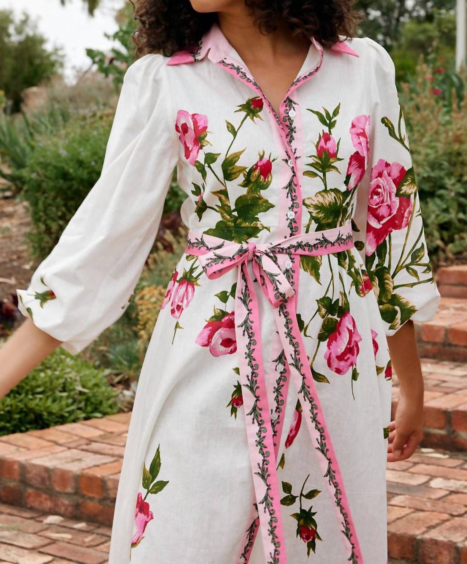 Just add slides or mules and you are good to go. Embrace romance and sophistication with the Lucille Midi Dress in Antique Rose by Aston Studio. This dress features three-quarter sleeves and highlights a floral pattern on a crisp white base, combining a button closure with a detachable belt tie for a flattering A-line silhouette. Crafted from a linen blend, this holiday party essential is designed in Australia with meticulous attention to detail. For optimal care, it requires a gentle hand wash. Model is 173cm wearing an AU8/US4.